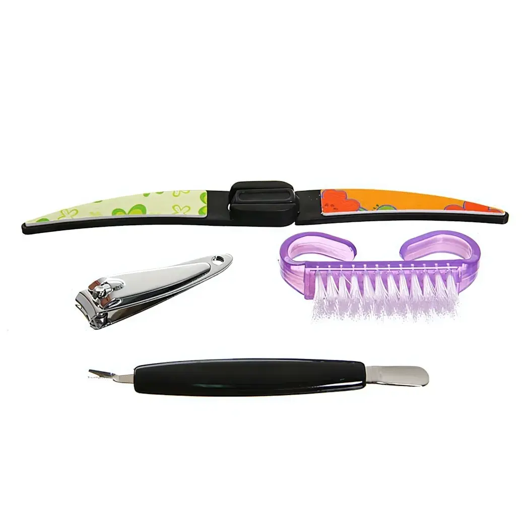 Каждый инструмент в наборе имеет уникальный дизайн и цветовую гамму, что делает его не только функциональным, но и стильным. Пилка для ногтей окрашена в зеленый цвет, кусачки имеют хромированное покрытие, а триммер и щетка выполнены в черном и фиолетовом цветах соответственно. Набор упакован в удобную картонную подложку, что делает его отличным подарком для близких.