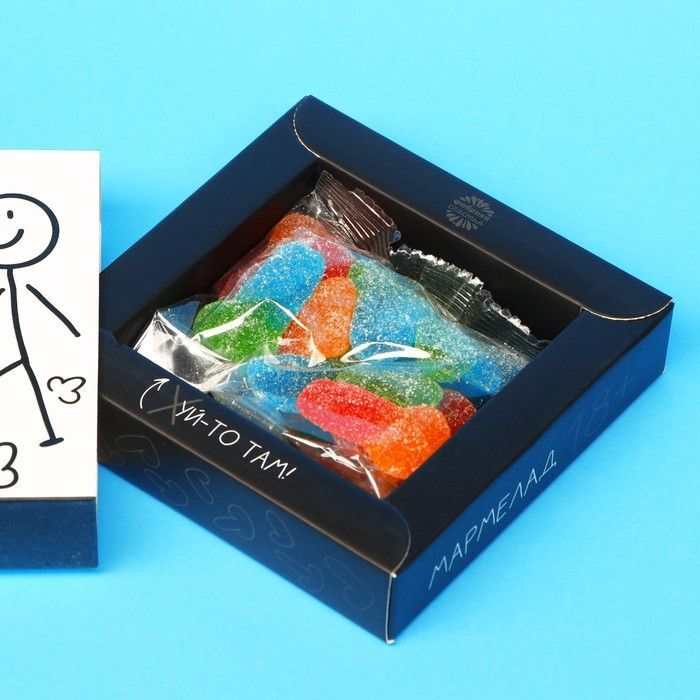 Объем упаковки составляет 50 гр, что делает её идеальной для одного раза. Внутри вы найдете мармелад в различных ярких цветах, таких как синий, зеленый и красный, что добавляет разнообразия и делает его привлекательным для глаз. Упаковка оформлена с юмором и креативом, что подчеркивает её развлекательный характер.