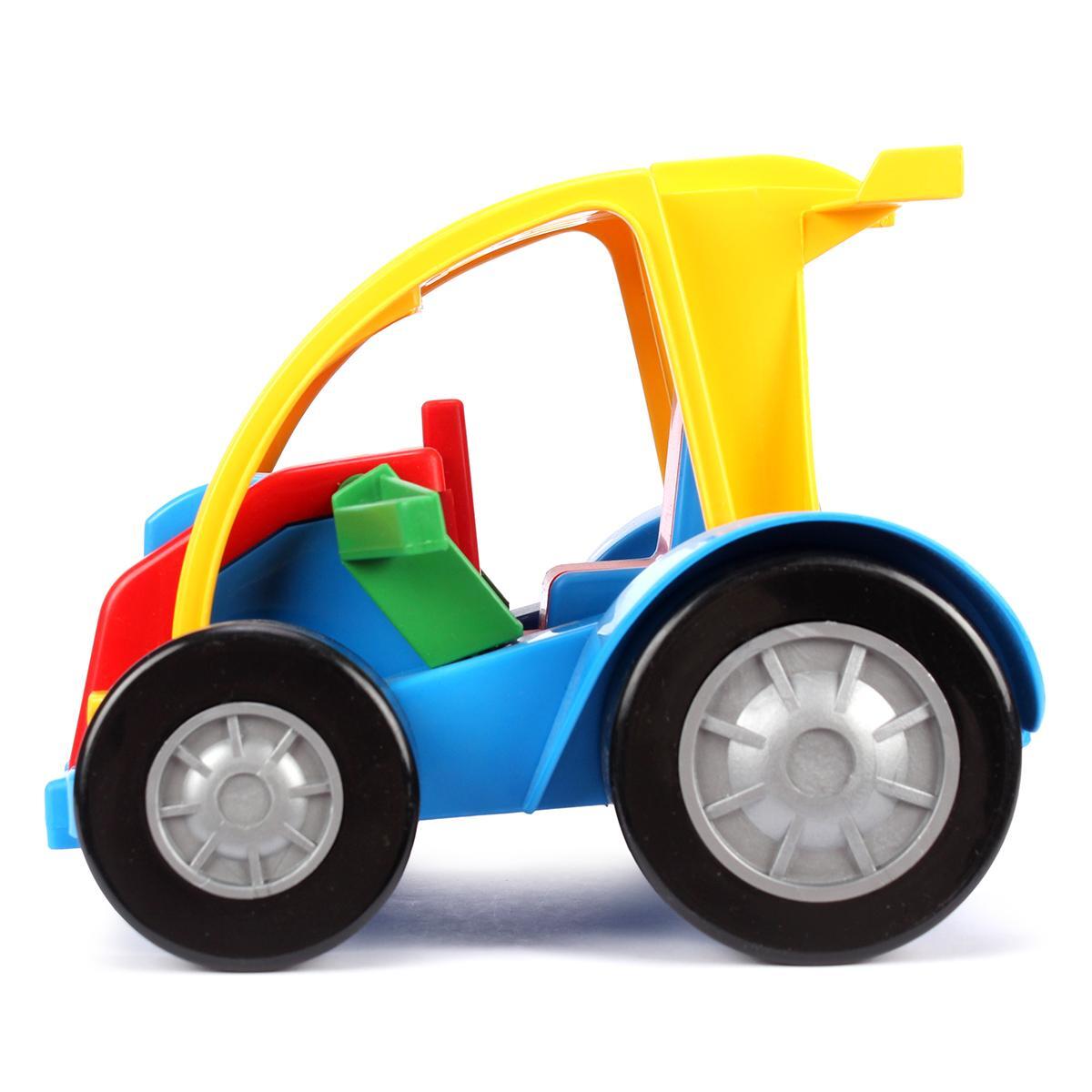 Машинка имеет округлую форму и четко обозначенные колеса, что делает ее удобной для маленьких ручек. Она выполнена в нескольких ярких цветах: красном, желтом, зеленом и синем. Игрушка не содержит мелких деталей, что обеспечивает безопасность во время игры. Размеры не указаны, но игрушка стандартного размера для детских игрушек, что делает ее подходящей для детей от 3 лет.