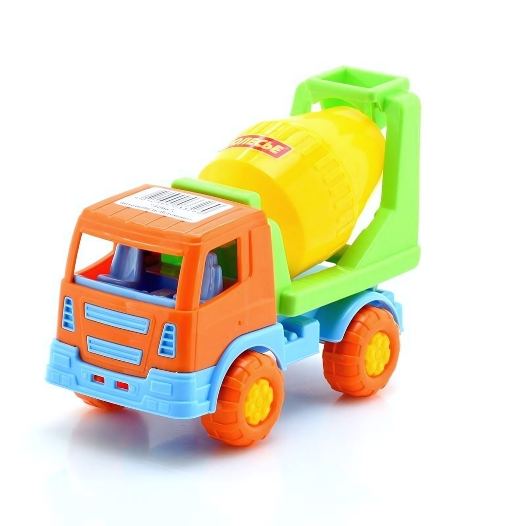 - Яркие цвета: оранжевый кузов, голубые детали, зеленая рамка и желтый миксер привлекают внимание детей.
