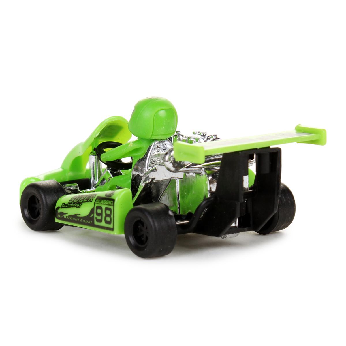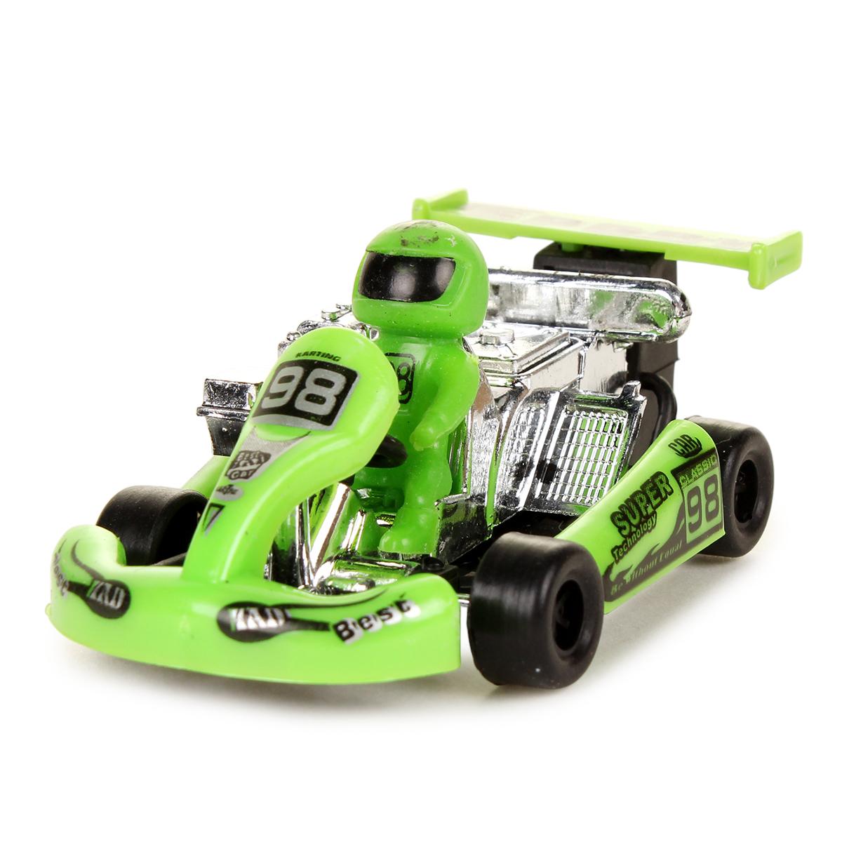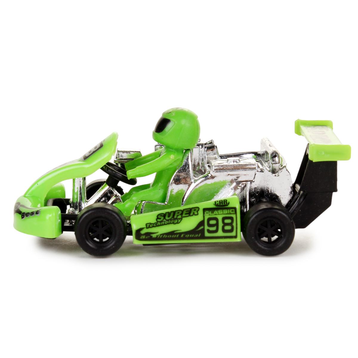 Машинка выполнена в масштабе игрушки из качественного пластика с детализированной проработкой элементов: хромированные части корпуса, прорезиненные колеса и фигурка гонщика в цветном шлеме.