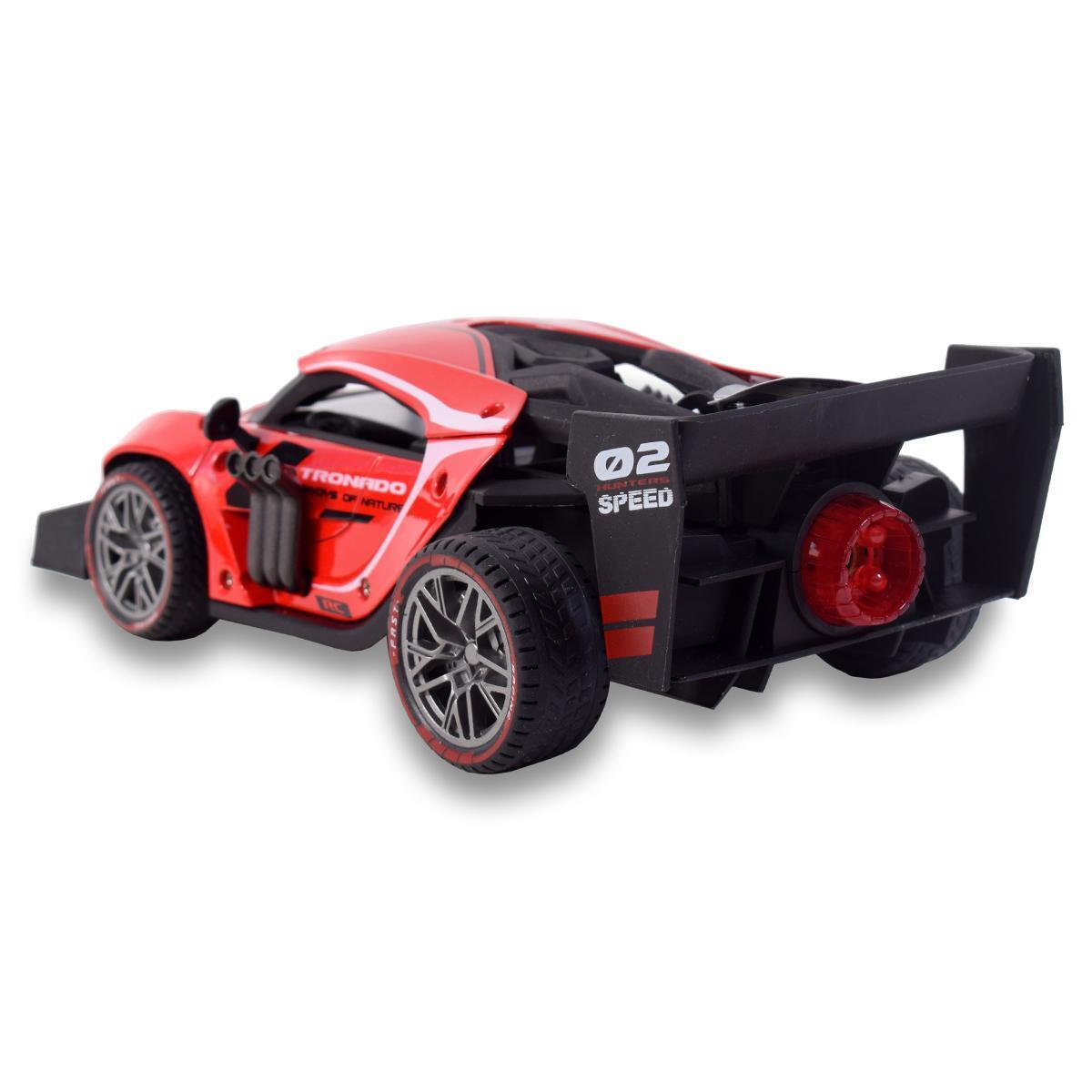 Корпус из ударопрочного пластика выдерживает активные игры, а аэродинамический спойлер повышает устойчивость на виражах. Яркий красный цвет с контрастными деталями делает машинку заметной даже при ночных заездах.