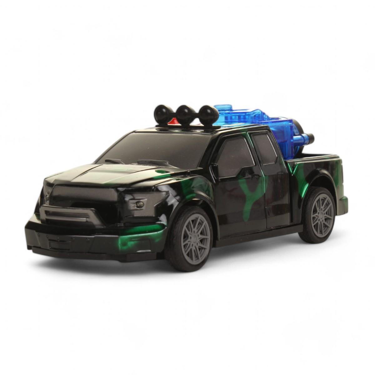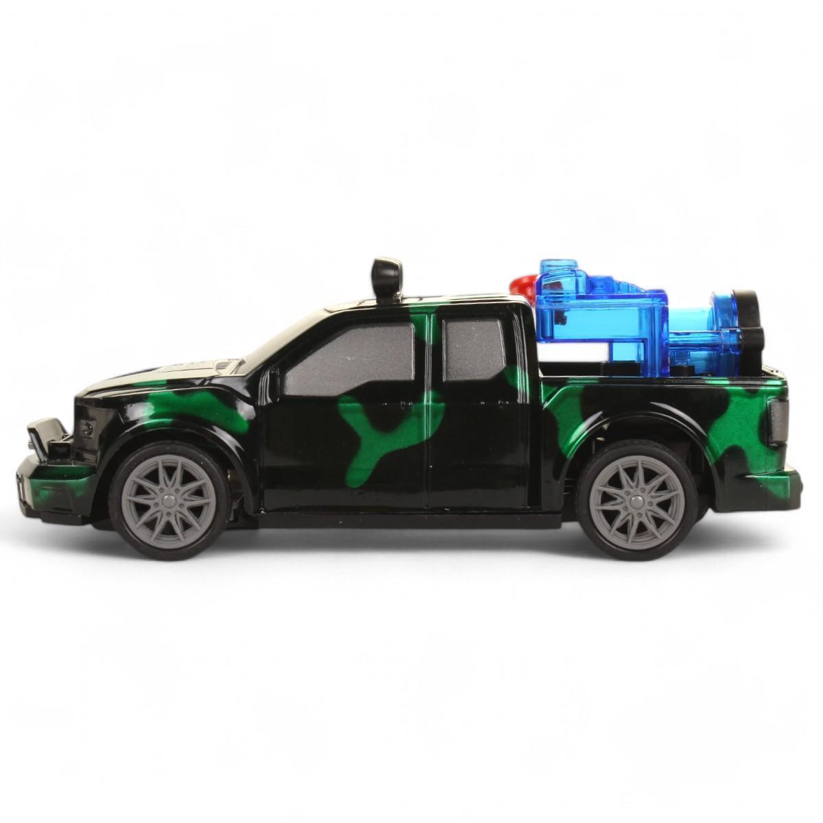 Яркий камуфляжный окрас в зеленых и черных тонах с синими акцентами делает машинку заметной на любой поверхности. Возможность открывания дверей добавляет реалистичности игровому процессу. Идеальный подарок для развития координации и воображения у детей!
