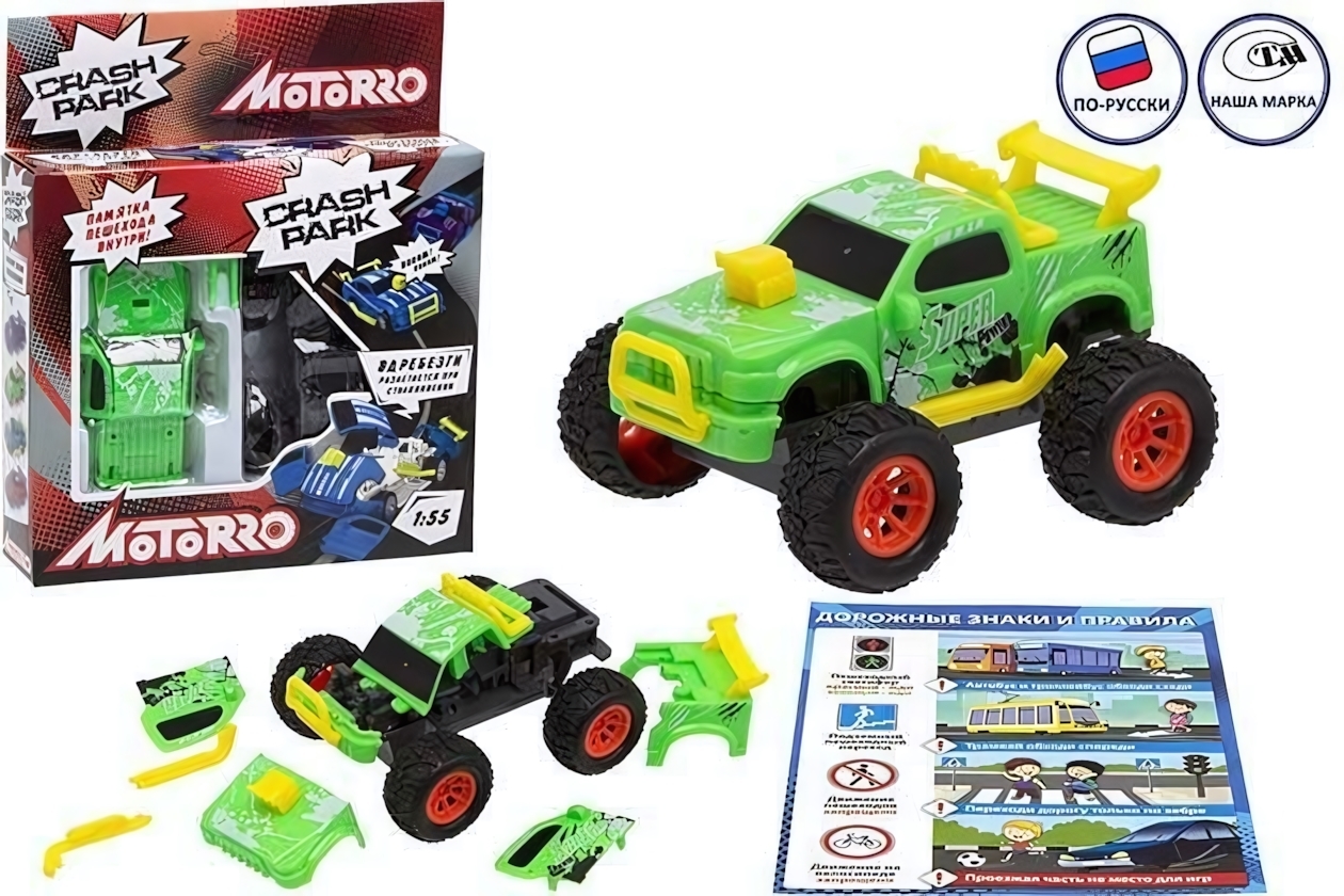 Размеры автомобиля составляют приблизительно 1:55 масштаба, комплект включает элементы конструкции, инструкции по сборке и дорожные знаки для разыгрышей сюжетных сцен. Сделайте игровой процесс увлекательным и полезным с этим конструктором!