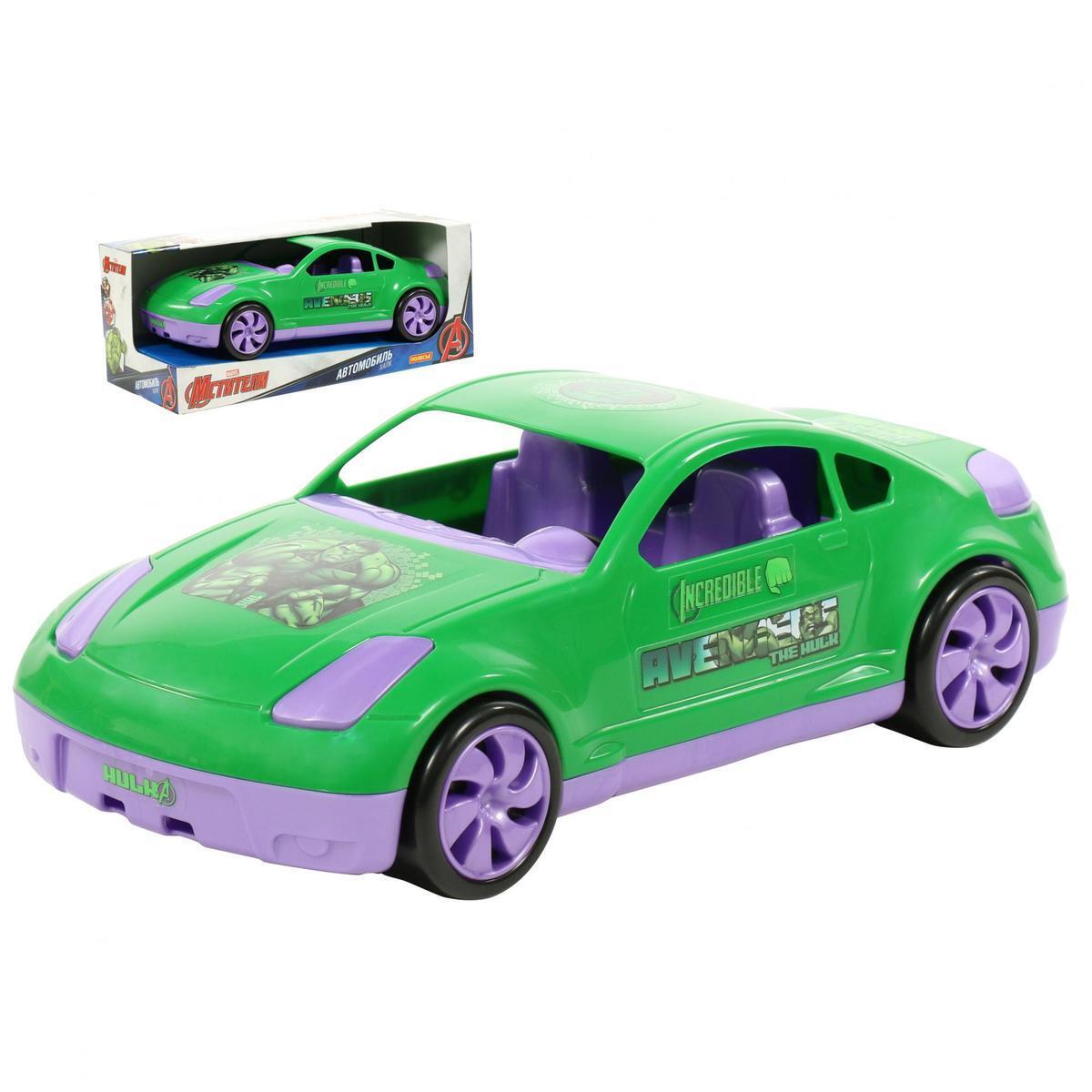 Машина имеет зеленый корпус с фиолетовыми элементами, включая колеса и внутреннюю обивку. Она выполнена в классическом спортивном стиле, что делает её привлекательной для детей. Размеры машины не указаны, но она предназначена для удобного использования детьми. Упаковка также оформлена в стиле Marvel, что делает её отличным подарком для любого маленького фаната.