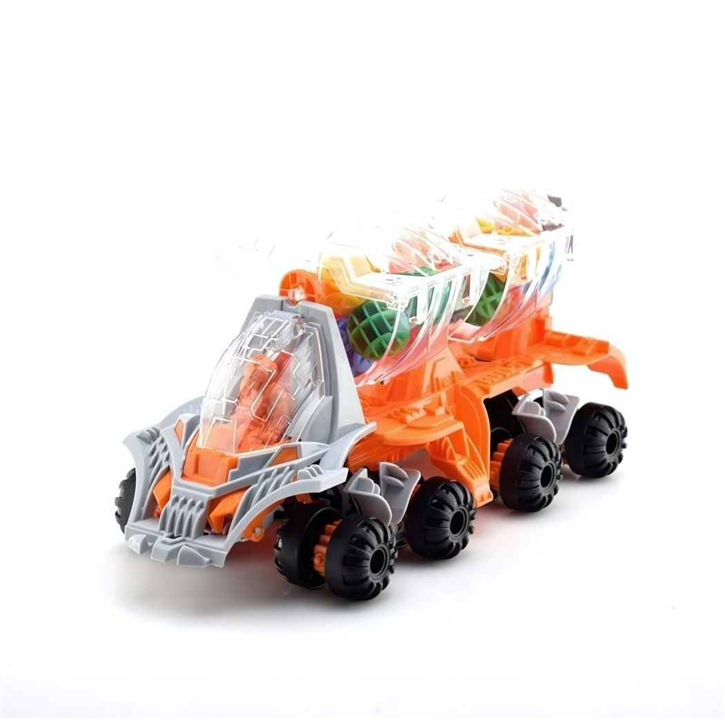 - Детализированная конструкция: прозрачные контейнеры с цветными элементами, большие фары и агрессивный передок делают игрушку максимально реалистичной.