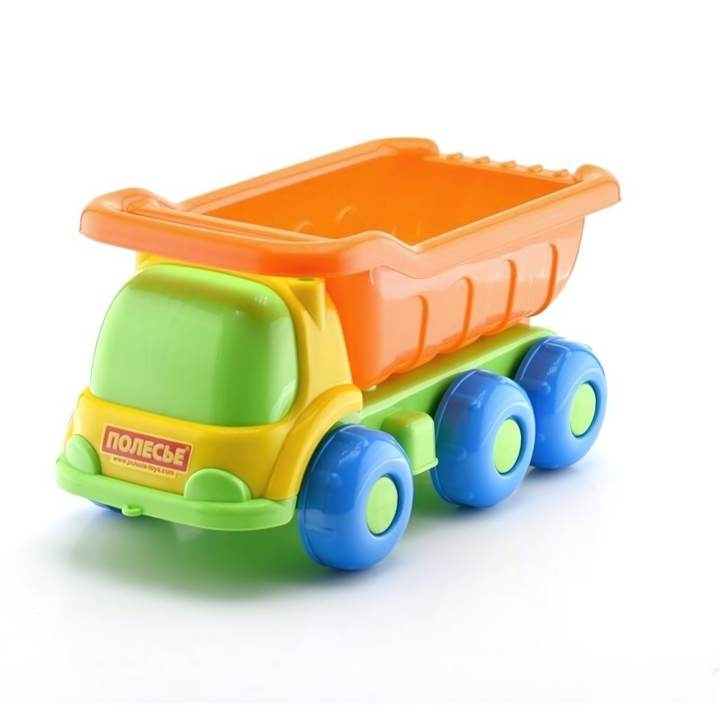 Игрушка изготовлена из ударопрочного пластика, устойчивого к падениям и активным играм. Сочетание зеленой кабины, оранжевого кузова и голубых колес создает контрастную палитру, важную для раннего цветовосприятия. Крупные детали (от 4 см) и отсутствие острых углов обеспечивают безопасность детей от 1 года.