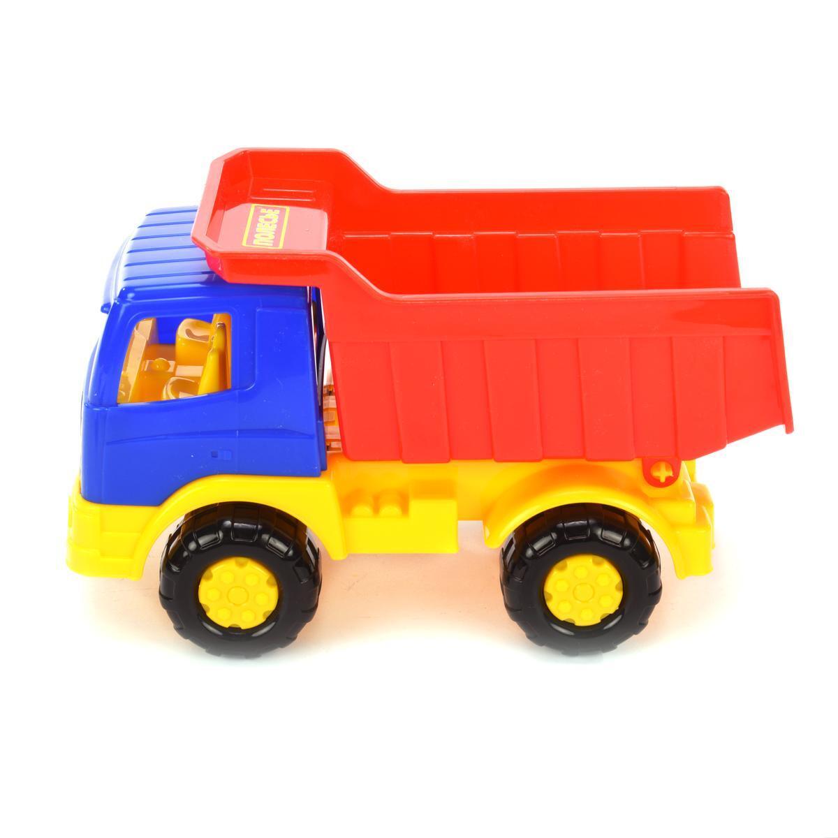 Самосвал выполнен из прочной пластмассы. Размер 22x11x13 см — идеальный, чтобы разместить игрушку на полке или взять с собой на прогулку. Игрушка доставляется в сеточке, поэтому ее удобно хранить и дарить друзьям.