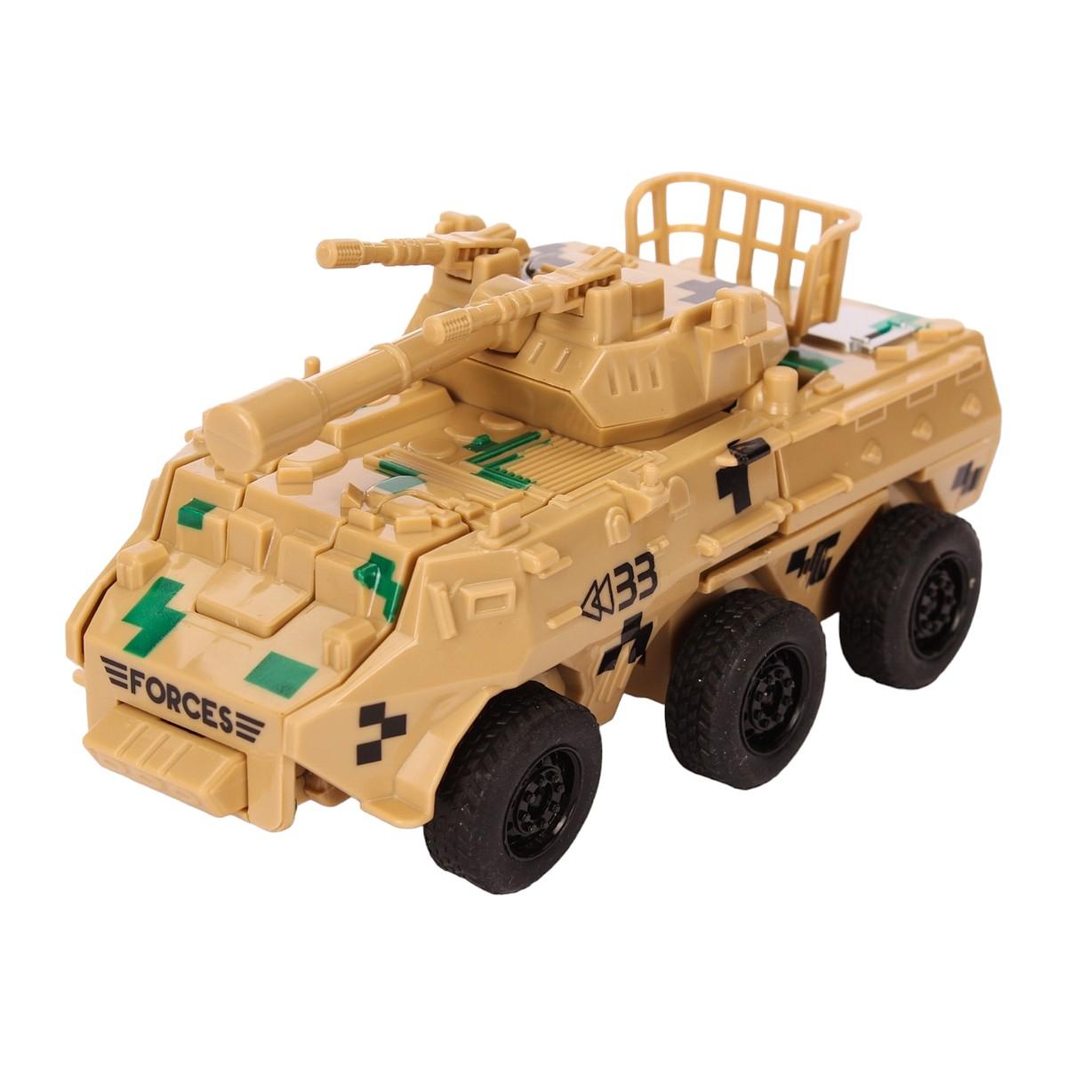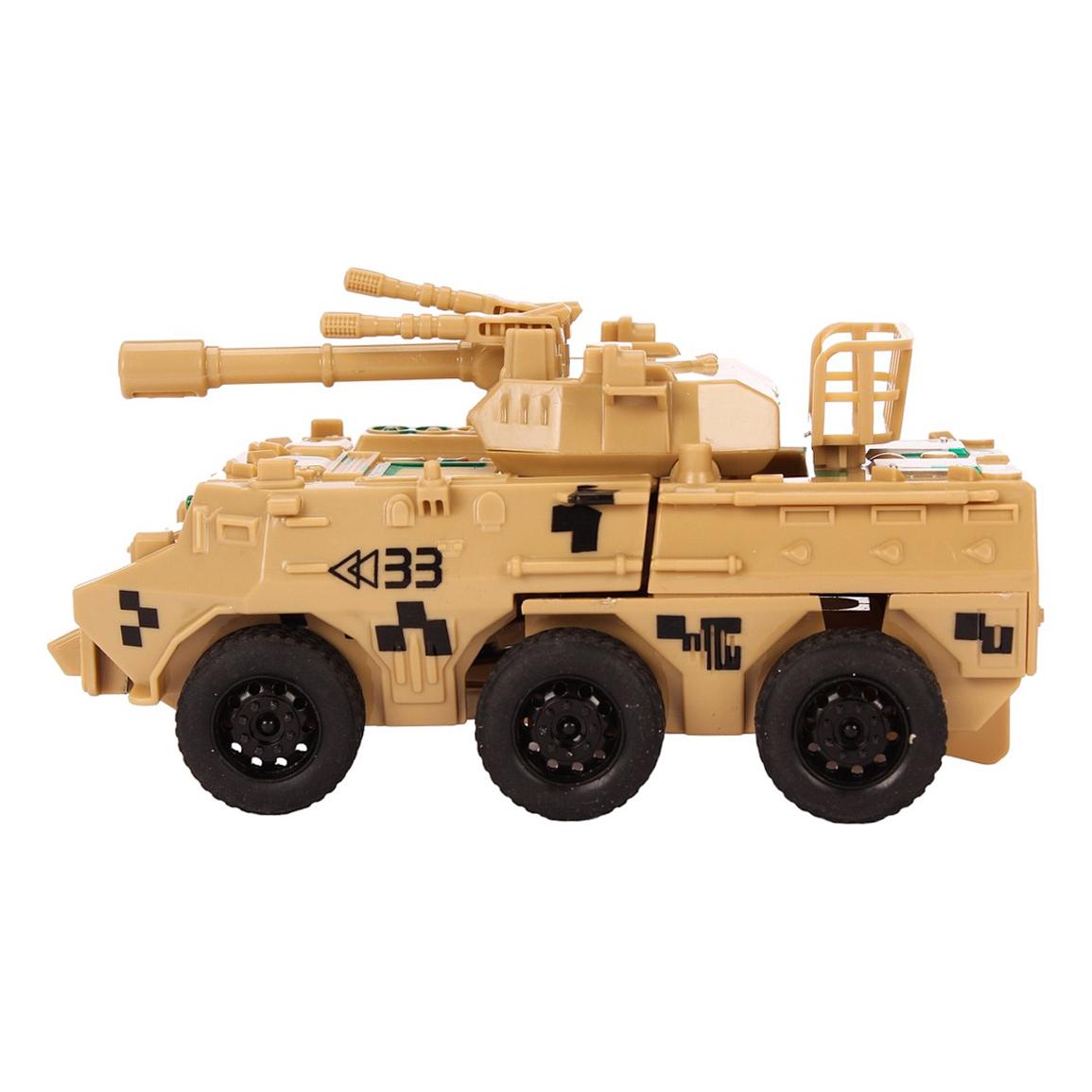 Длина машины — 13 см, оптимальна для детской игры. Пластиковый корпус окрашен в песочный цвет, на котором выделяются черные и зелёные элементы камуфляжа. Реалистичная пушка на крыше, защитная решетка и военные маркировки делают игрушку особенно интересной. Эта модель станет отличным дополнением к любой коллекции или центром увлекательных сценариев в детских играх.