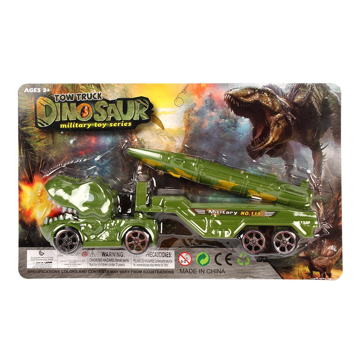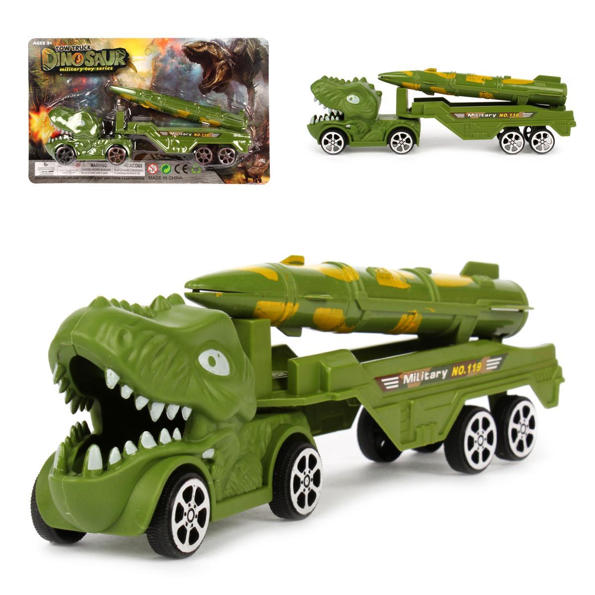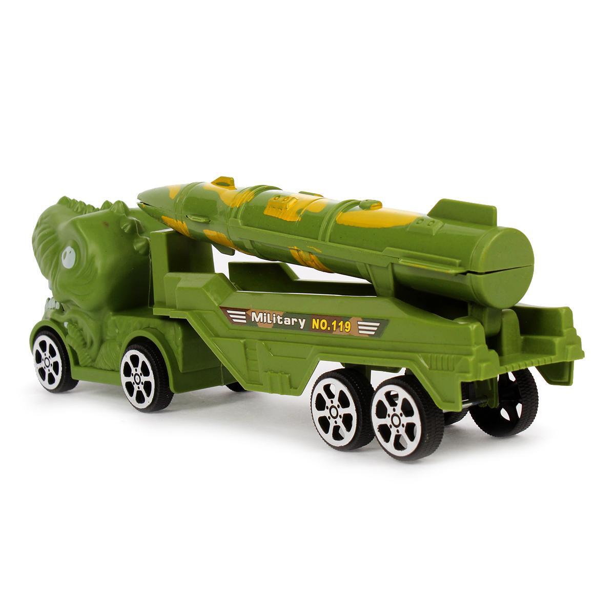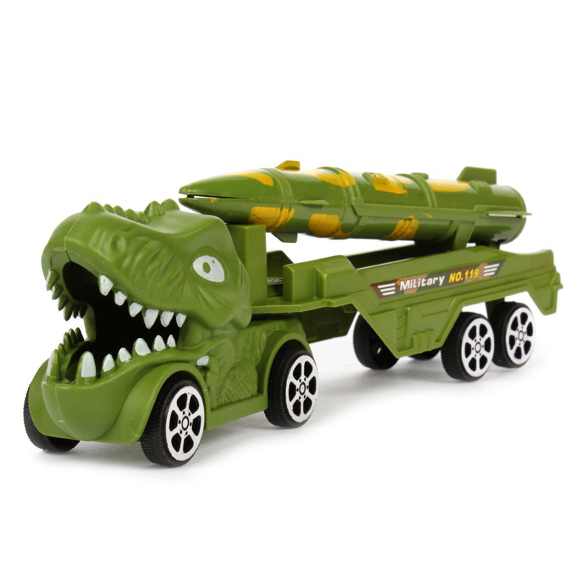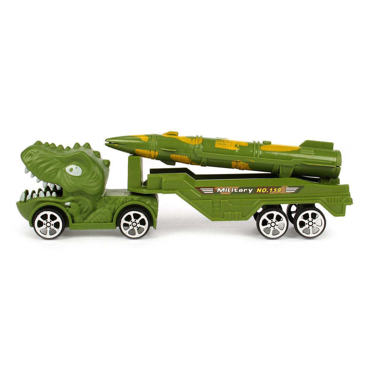 Инерционный грузовик с ракетной установкой сочетает реалистичный военный дизайн и фантазийные элементы. Стилизация под голову динозавра с детализированной пастью и глазами пробуждает интерес к приключениям, а функциональная ракетная платформа добавляет сюжетности играм.