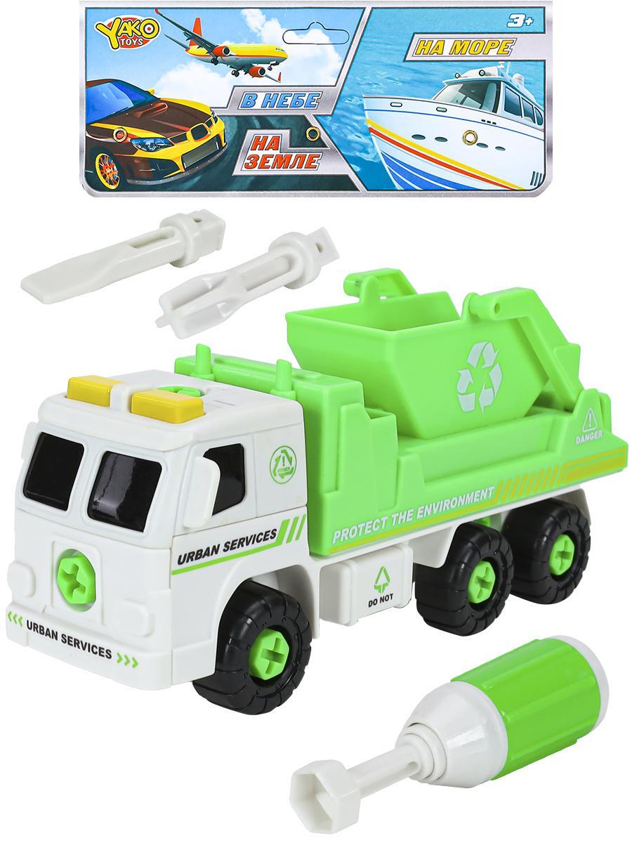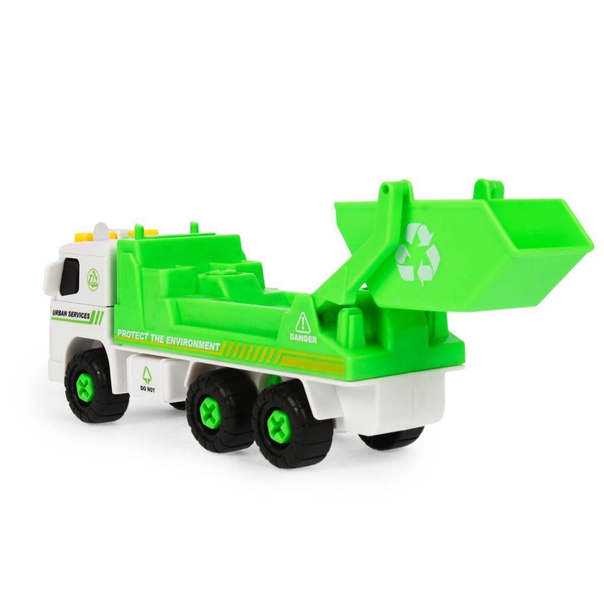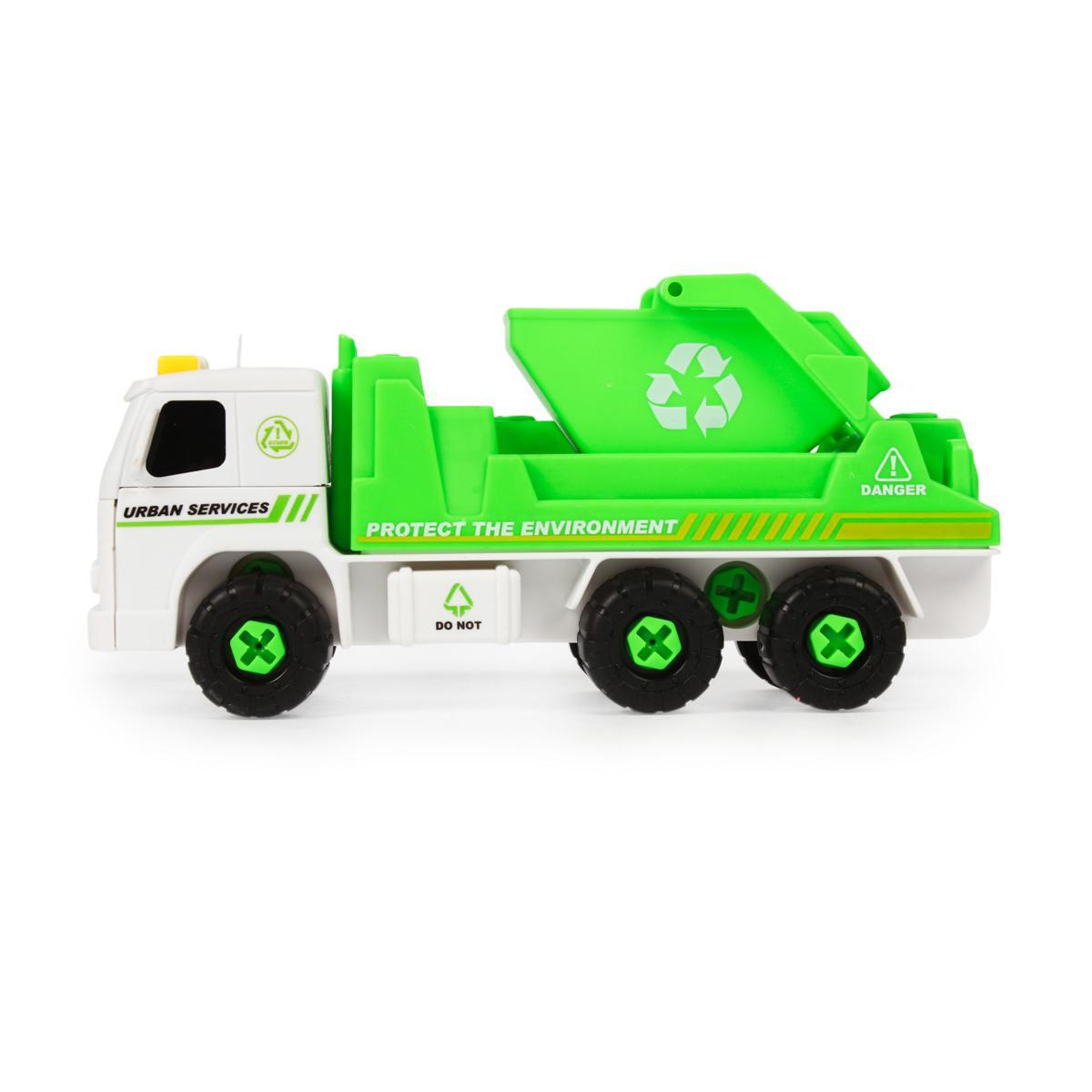 Машинка-мусоровоз с разборными деталями увлечет ребенка на часы, развивая логику и моторику. Реалистичный дизайн с символикой переработки учит заботе об окружающей среде через игру.
