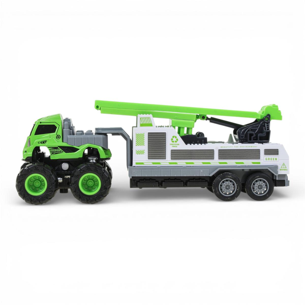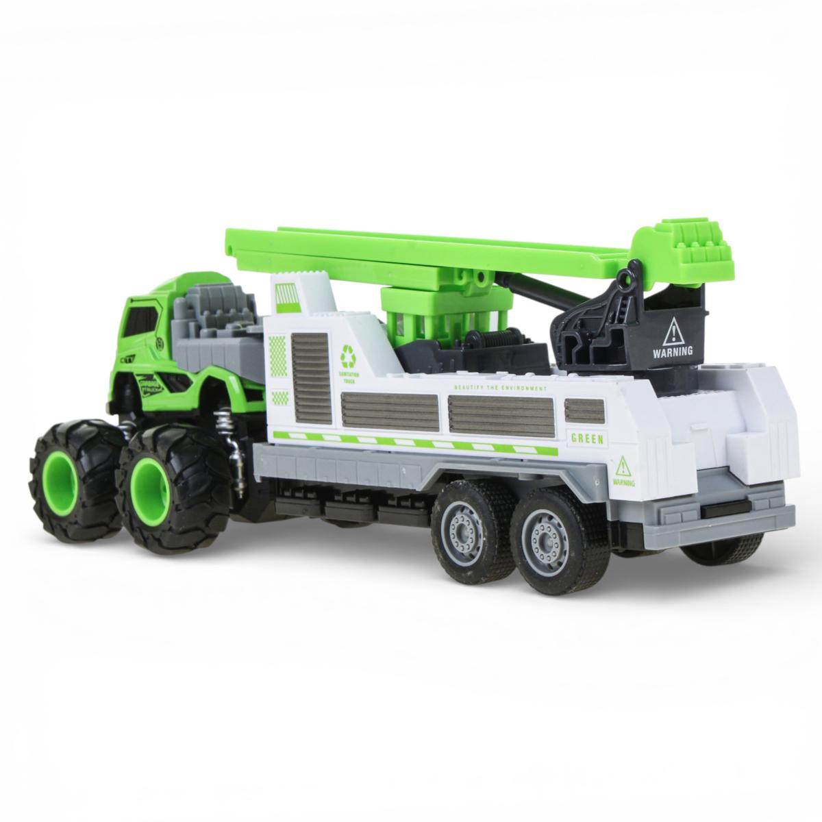 Грузовик поставляется в презентабельной коробке с прозрачным окном, что делает его готовым подарком на любой праздник. Компактный размер 28х9х12 см удобен для детских рук, а стильное цветовое решение в салатовых и серых тонах сразу привлекает внимание на полке с игрушками.