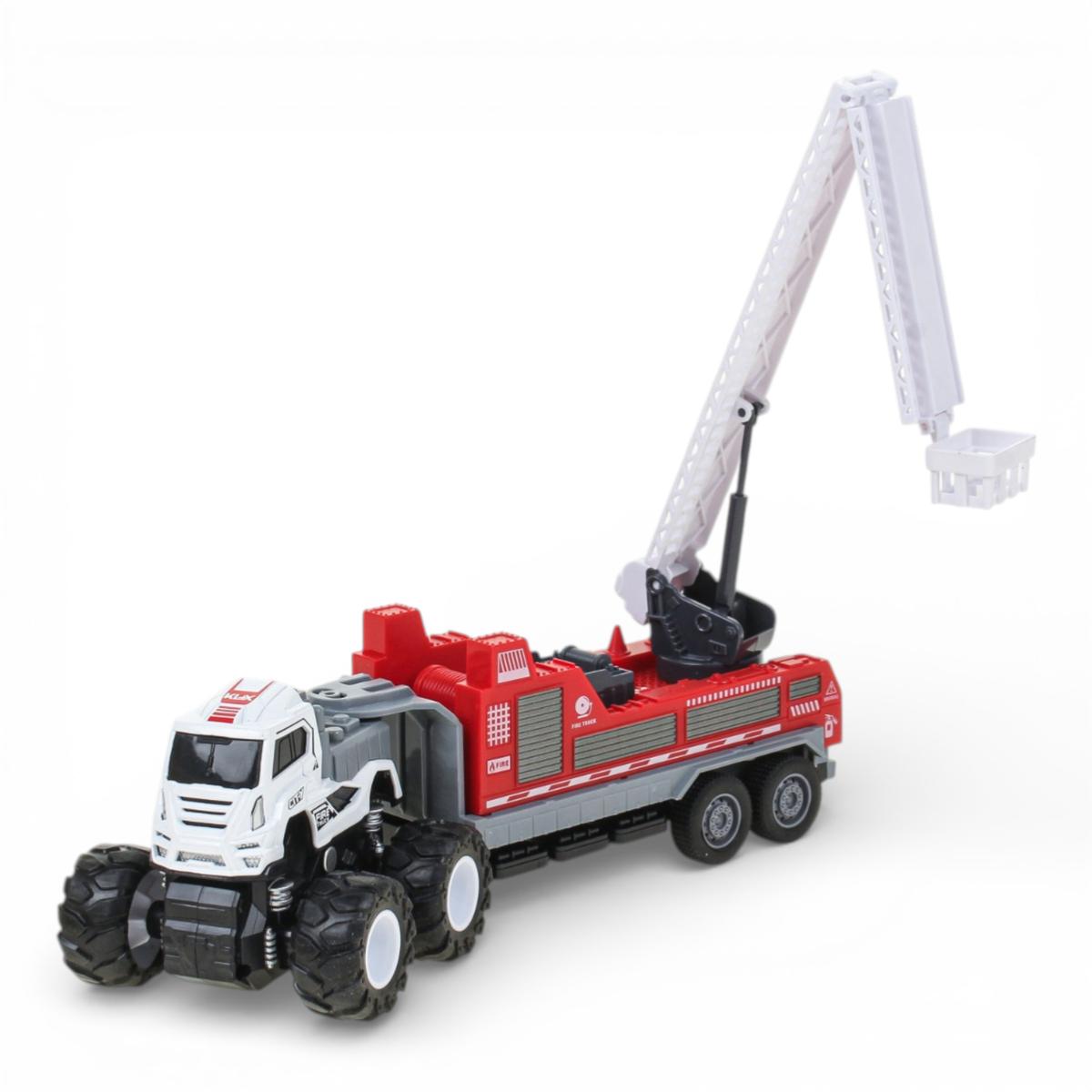 Игрушка оснащена надежным инерционным механизмом: достаточно немного разогнать машину, и она самостоятельно продолжит движение. Главная особенность модели — телескопическая пожарная лестница, расположенная на прицепе. В разложенном состоянии длина лестницы достигает 30 см, а специальное поворотное основание позволяет направлять её в любую сторону для имитации настоящих спасательных операций и тушения огня.