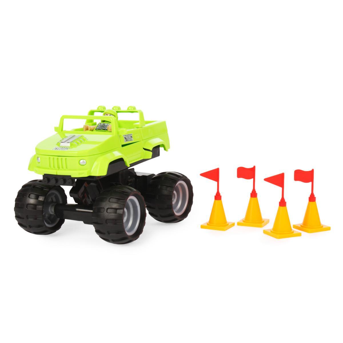 В набор входит: колесная база, 10 элементов кузова, фигурка водителя, пульт ДУ, набор наклеек, аккумуляторный блок, USB-кабель, 4 дорожных конуса с флажками.