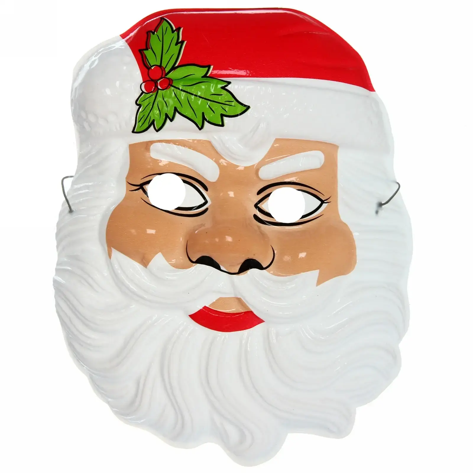 Маска имеет округлую форму с прорезями для глаз, что обеспечивает хороший обзор. Основные цвета маски: белый для бороды, красный для шапки и бежевый для лица. На шапке расположена зелёная ветка с красными ягодами, что добавляет дополнительный шарм. Размер маски универсален, что позволяет использовать её детям разного возраста.