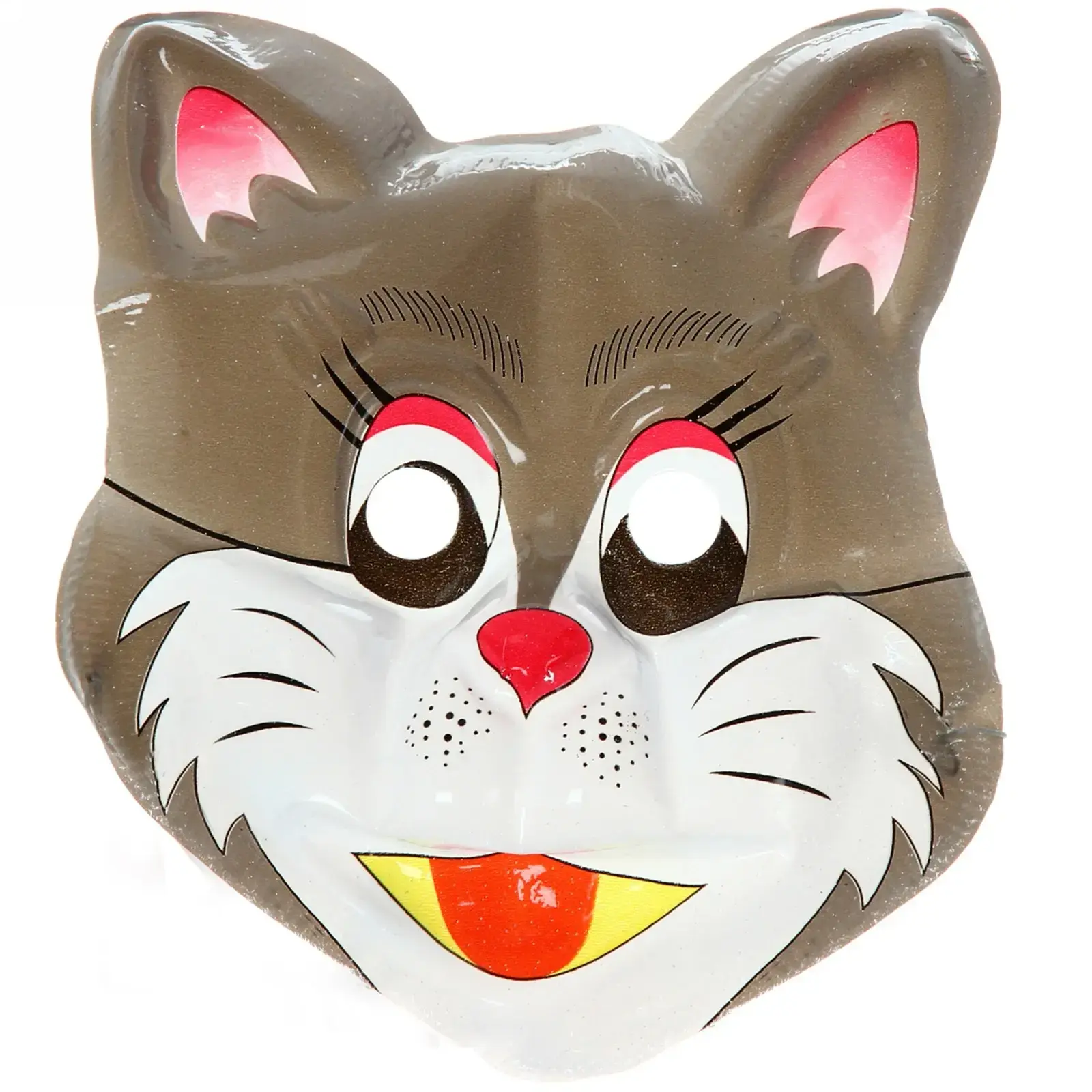 Маска имеет серо-коричневый цвет с белыми и красными элементами, что придает ей мультяшный вид. Она достаточно большая, чтобы удобно сидеть на лице ребенка. Размеры маски не указаны, но она подходит для большинства детей. Используйте маску «Котик» для создания незабываемых моментов на праздниках и в играх!
