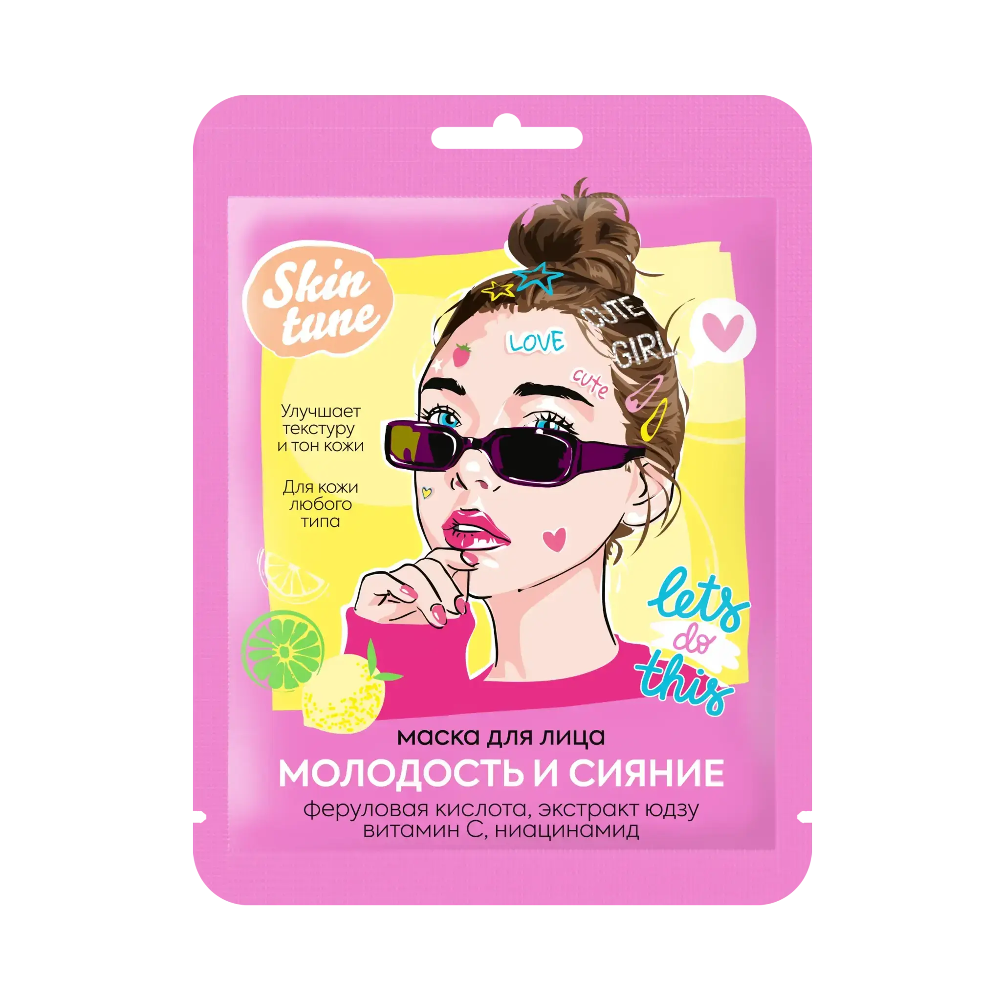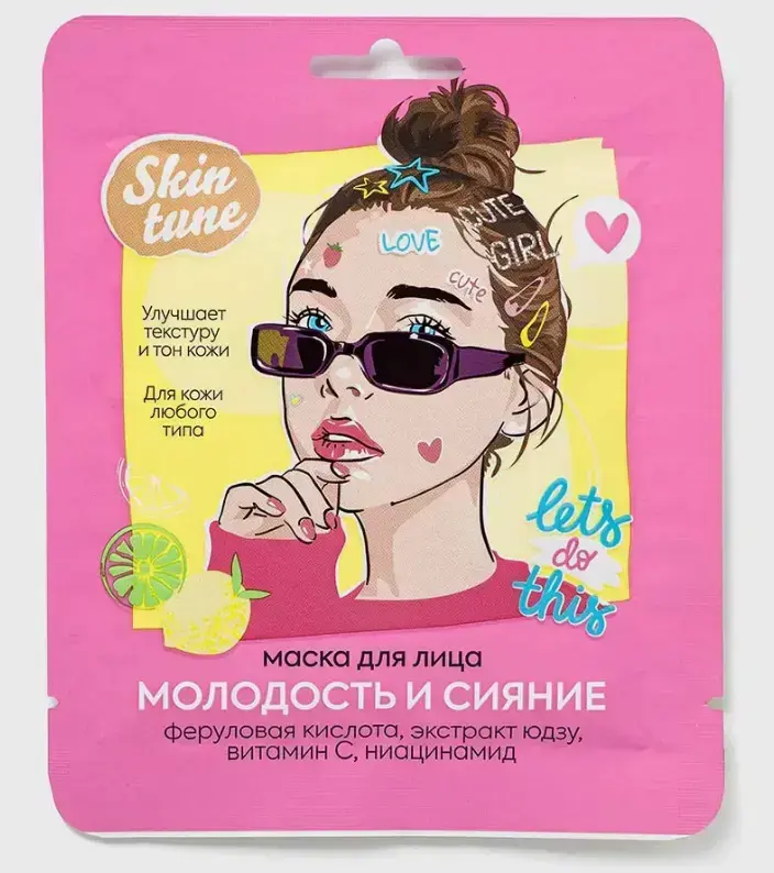 Упаковка маски выполнена в ярком розовом цвете и оформлена стильными иллюстрациями, что делает ее привлекательной для покупателей. Размер упаковки ориентировочно 20х15 см, что удобно для хранения и использования. Маска Skin tune станет отличным дополнением к вашему уходу за кожей, обеспечивая ей здоровье и красоту.