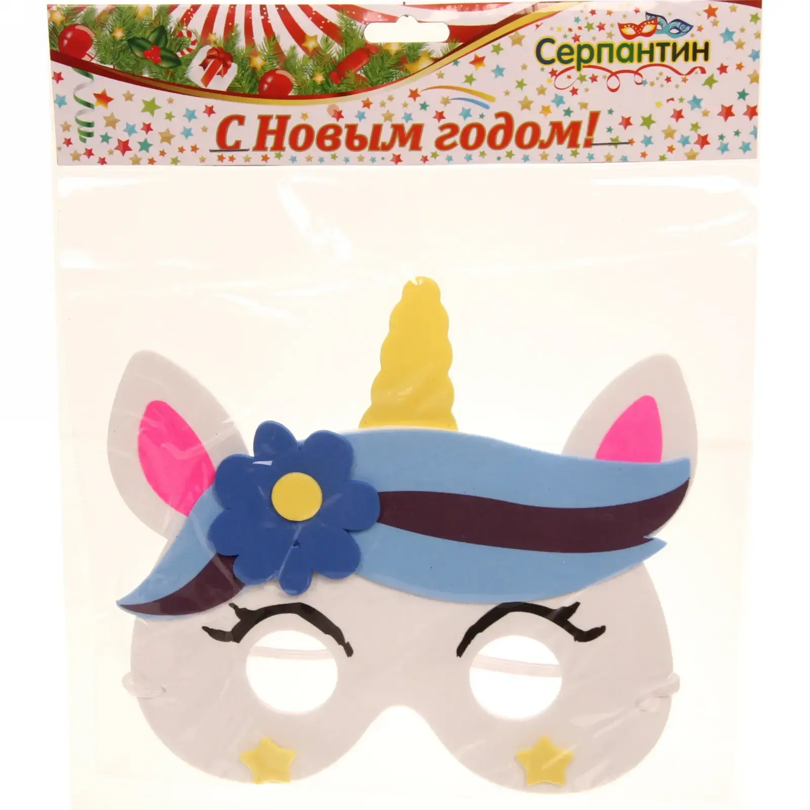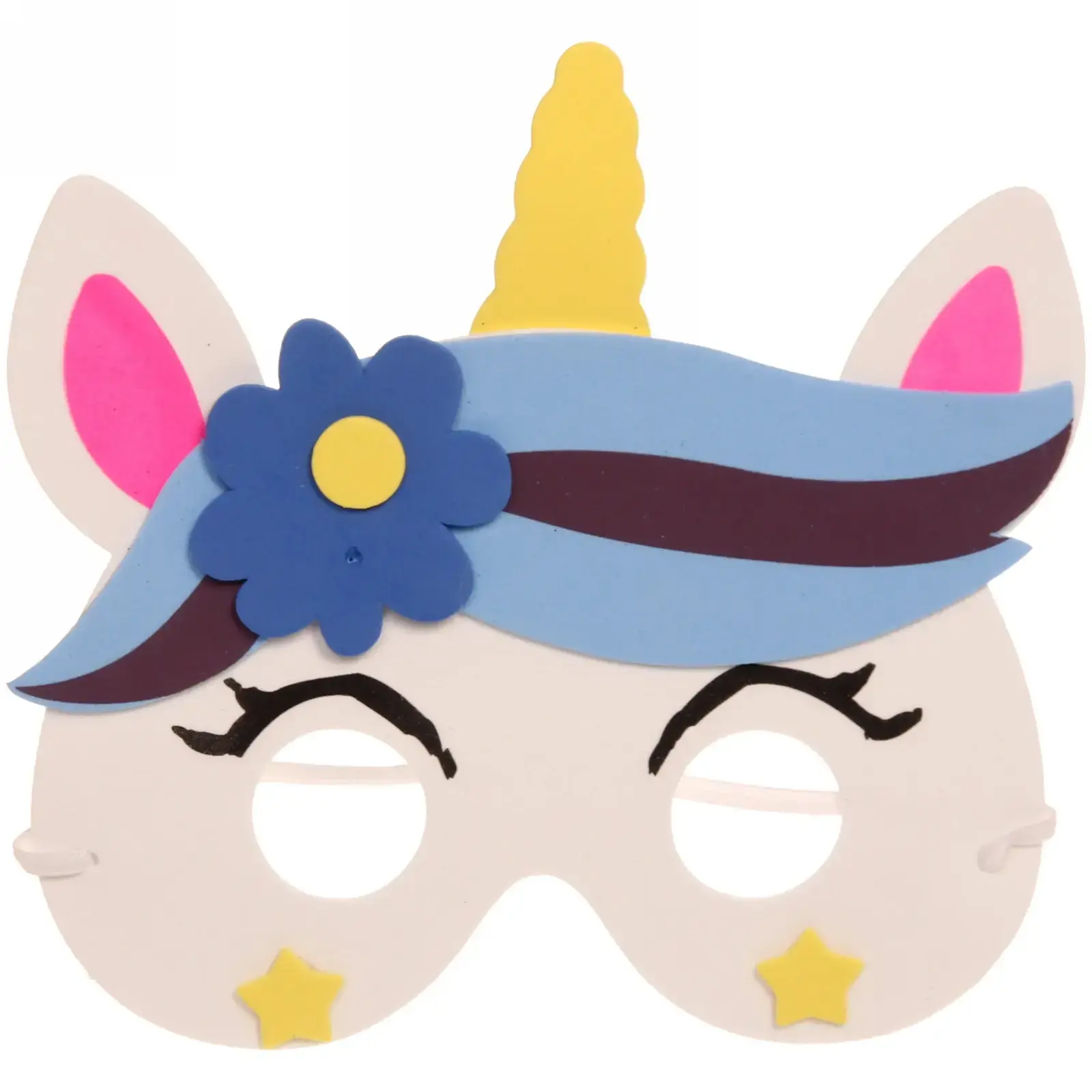 Маска имеет белый основной цвет с яркими акцентами: розовые ушки, желтый рог и синий цветок. Она достаточно большая, чтобы покрывать лицо, и украшена выразительными элементами, такими как улыбающееся лицо и звезды. Маска также оснащена резинкой для надежной фиксации на голове, что делает ее удобной в использовании.