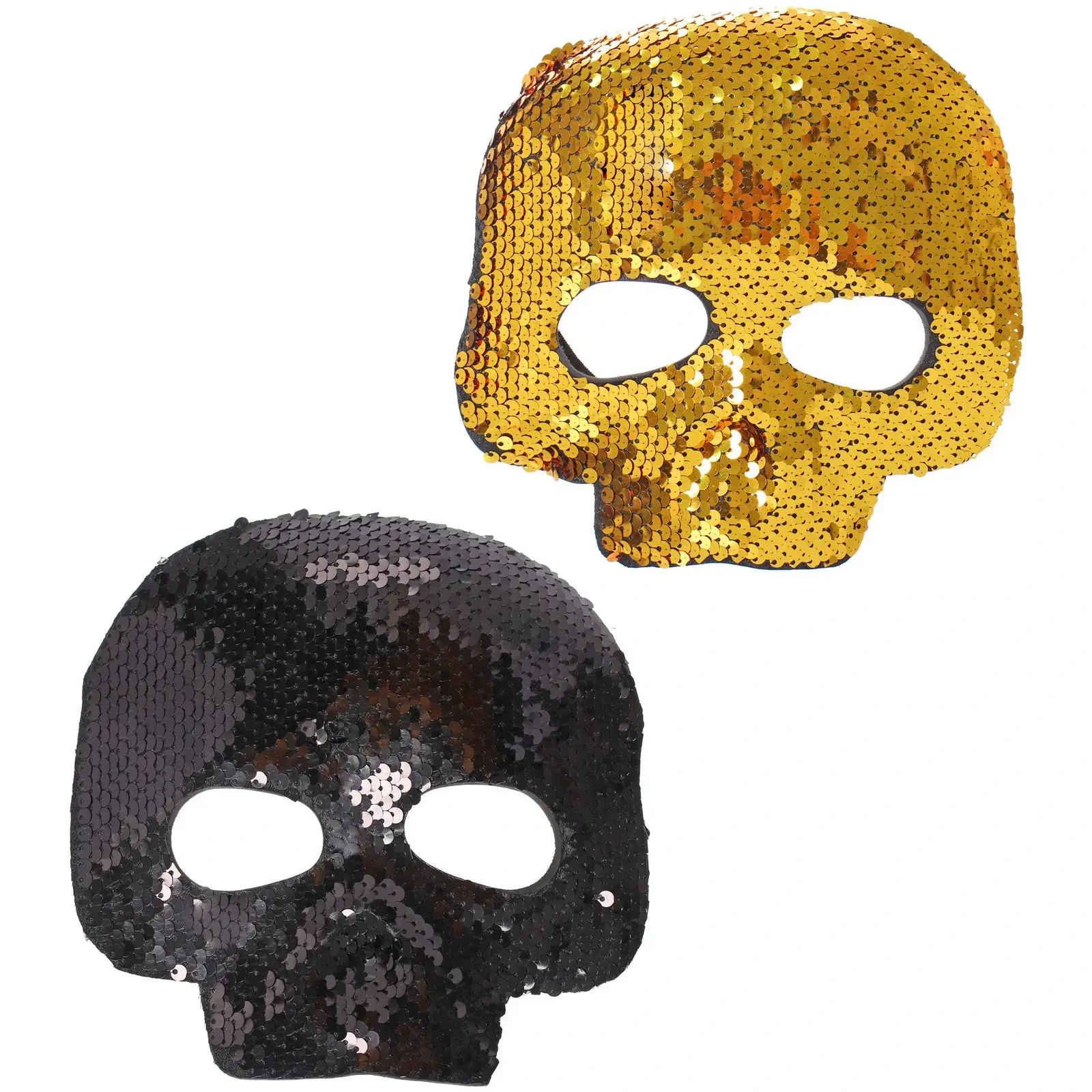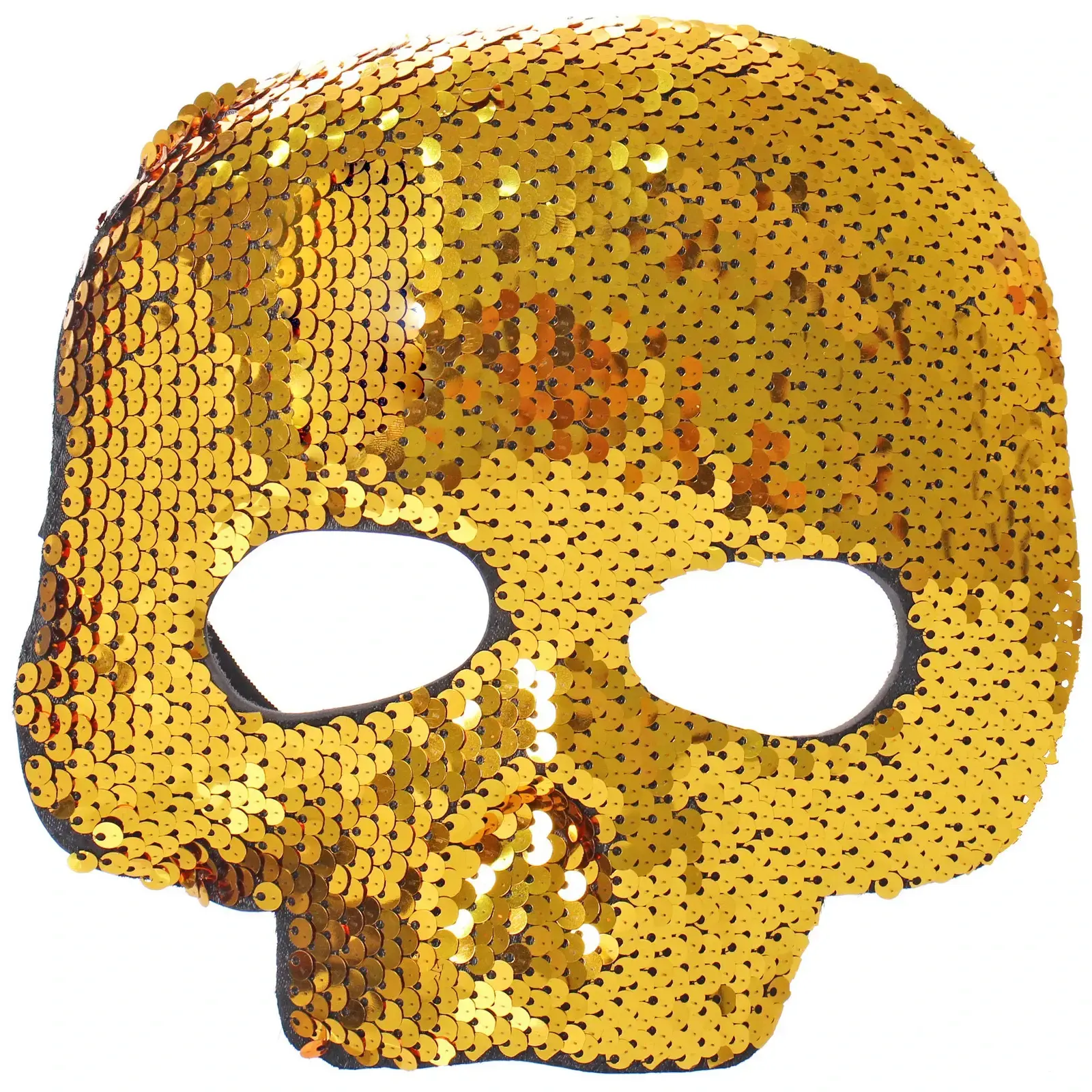 Маска выполнена в форме черепа и доступна в двух цветах: золотом и черном. Она имеет два выреза для глаз, что обеспечивает комфортное ношение. Маска подходит для взрослых и может использоваться как на карнавалах, так и на вечеринках, где требуется оригинальный и запоминающийся образ.