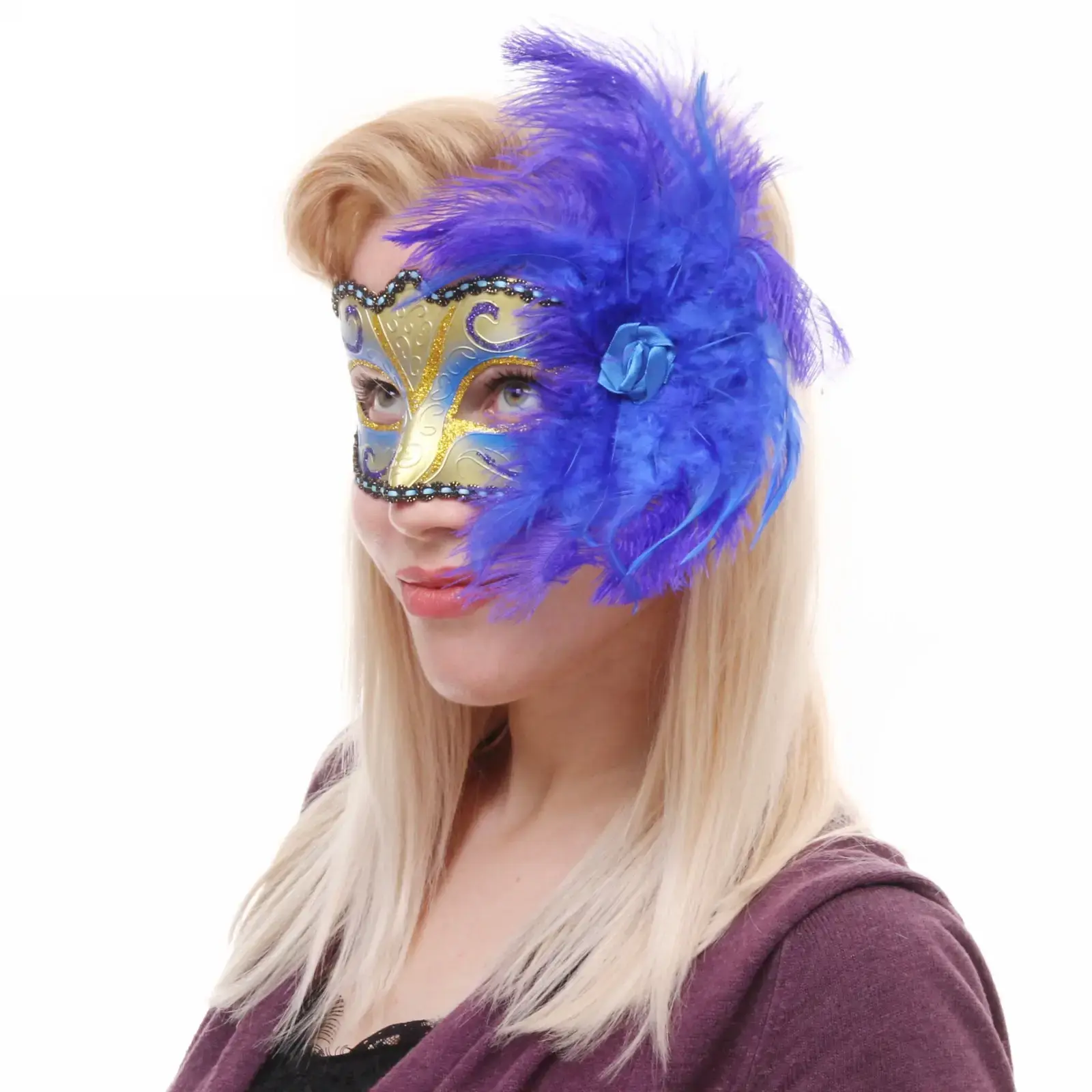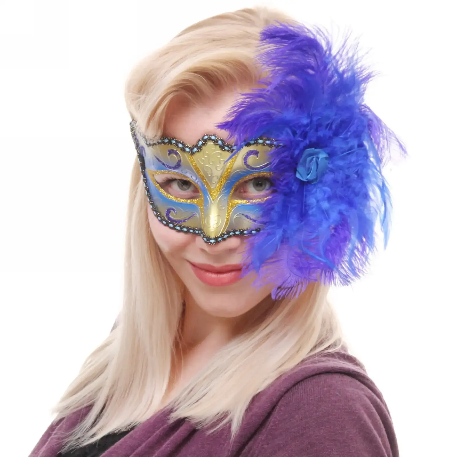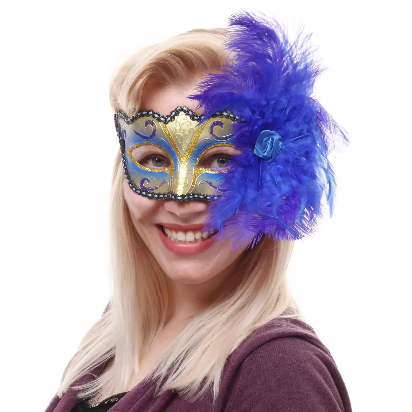 Маска сочетает элегантный дизайн и удобство ношения. Её украшают яркие детали: синие перья, декоративная роза и блестящие элементы. Золотистый цвет основы добавляет роскоши, а черная окантовка из страз создаёт контрастный акцент.