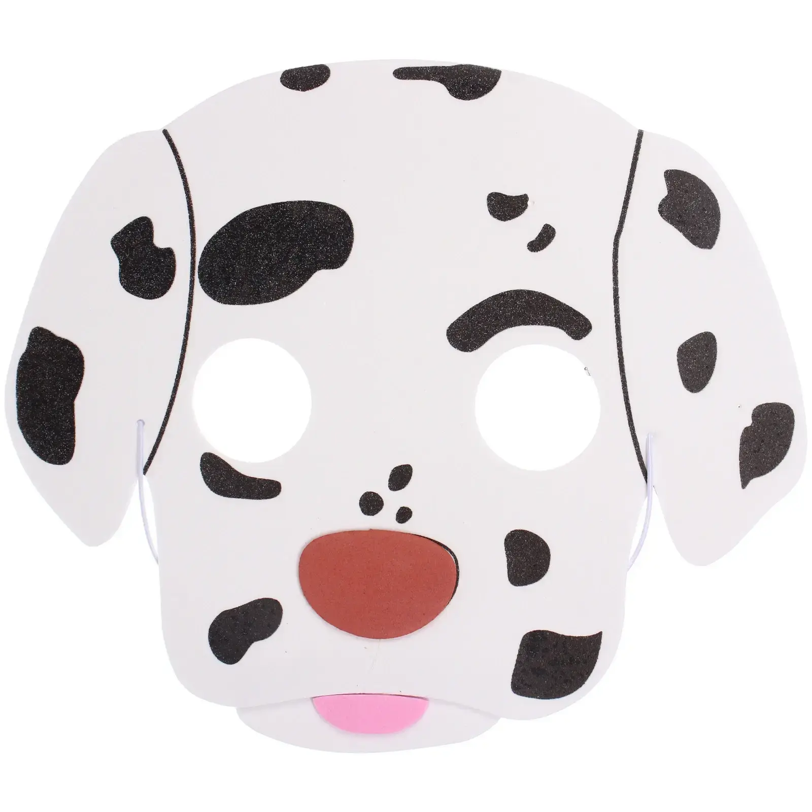 Маска имеет белый цвет с черными пятнами, имитирующими окрас собаки, и украшена элементами, придающими ей характерный вид. Она подходит для детей и может использоваться на различных мероприятиях, таких как дни рождения, утренники и карнавалы. Не упустите возможность сделать праздник вашего ребенка незабываемым с маской «Озорной Долматинец Джони»!