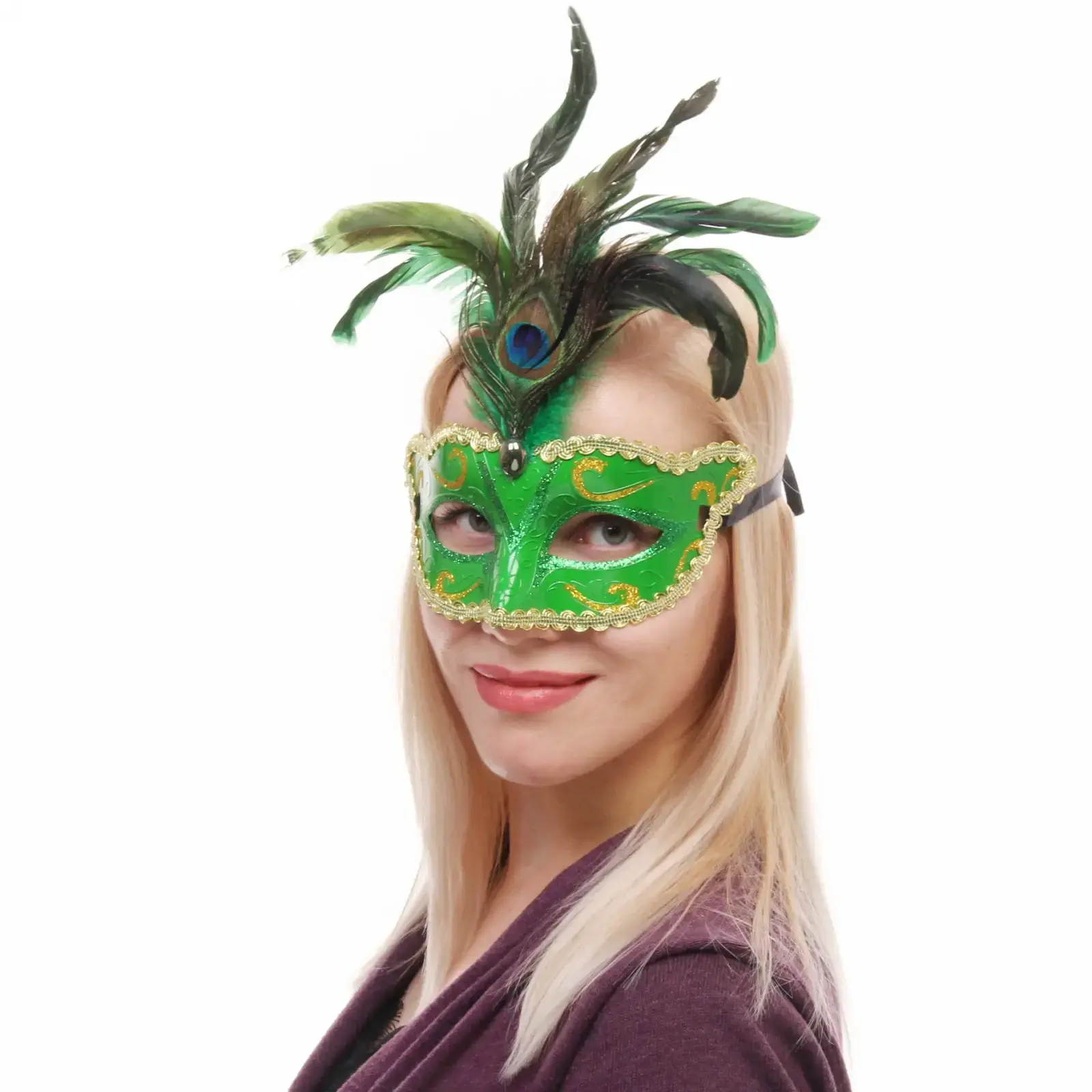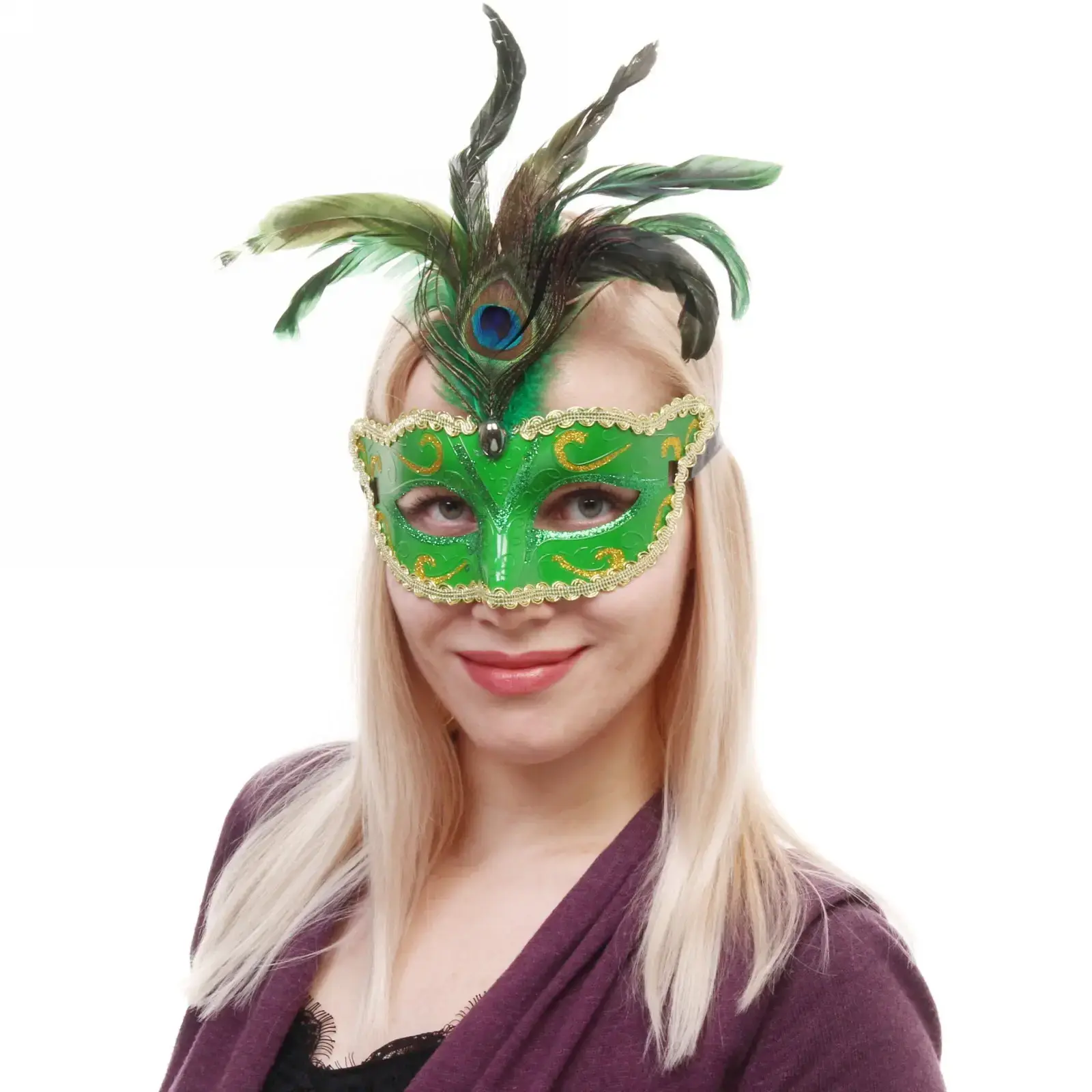 Погрузитесь в атмосферу праздника с карнавальной маской «Павлинье перо». Эта маска не только украсит ваш образ, но и добавит ярких красок в любое мероприятие. Ярко-зеленый цвет с золотыми узорами и эффектные перья делают её идеальным аксессуаром для карнавала, вечеринки или Нового года.