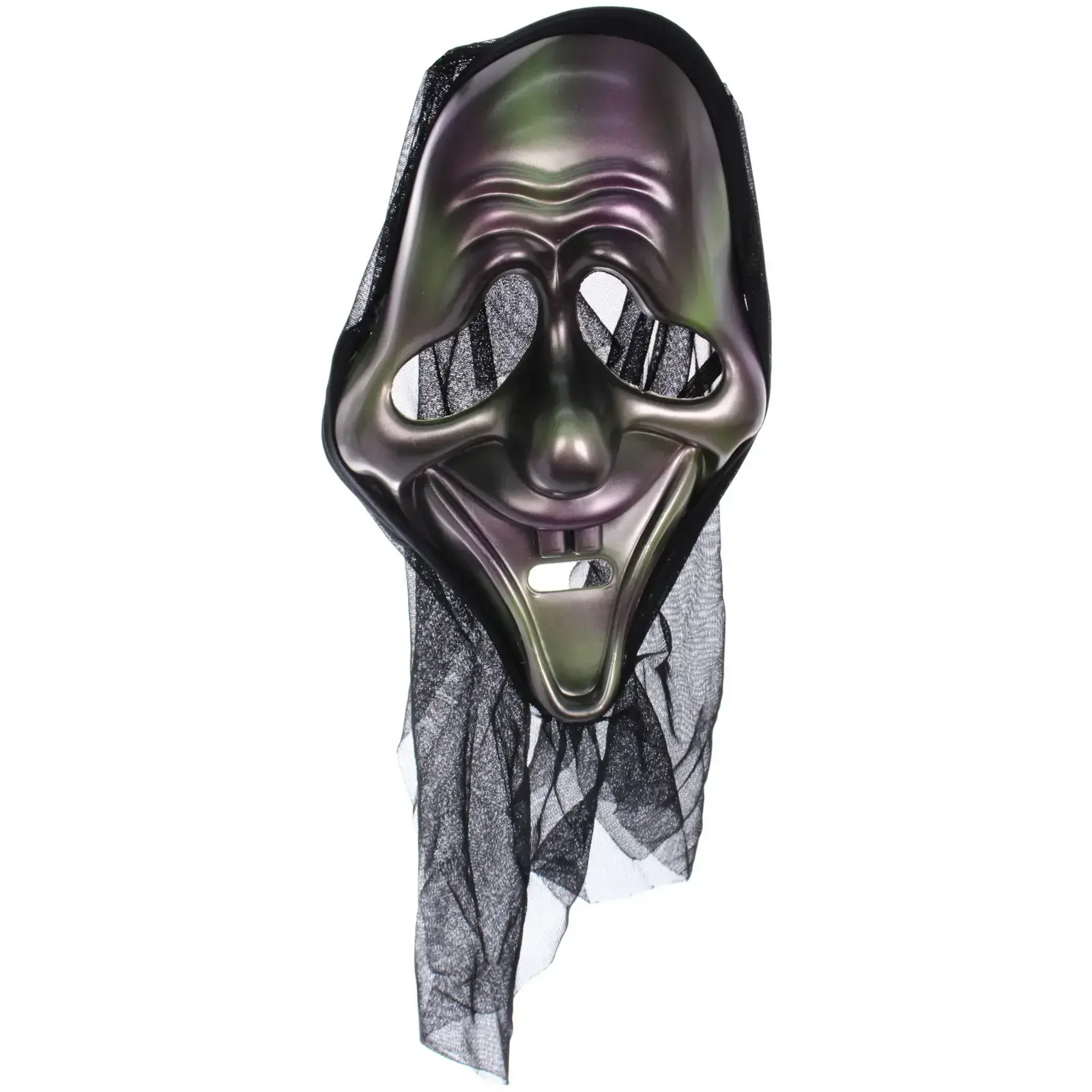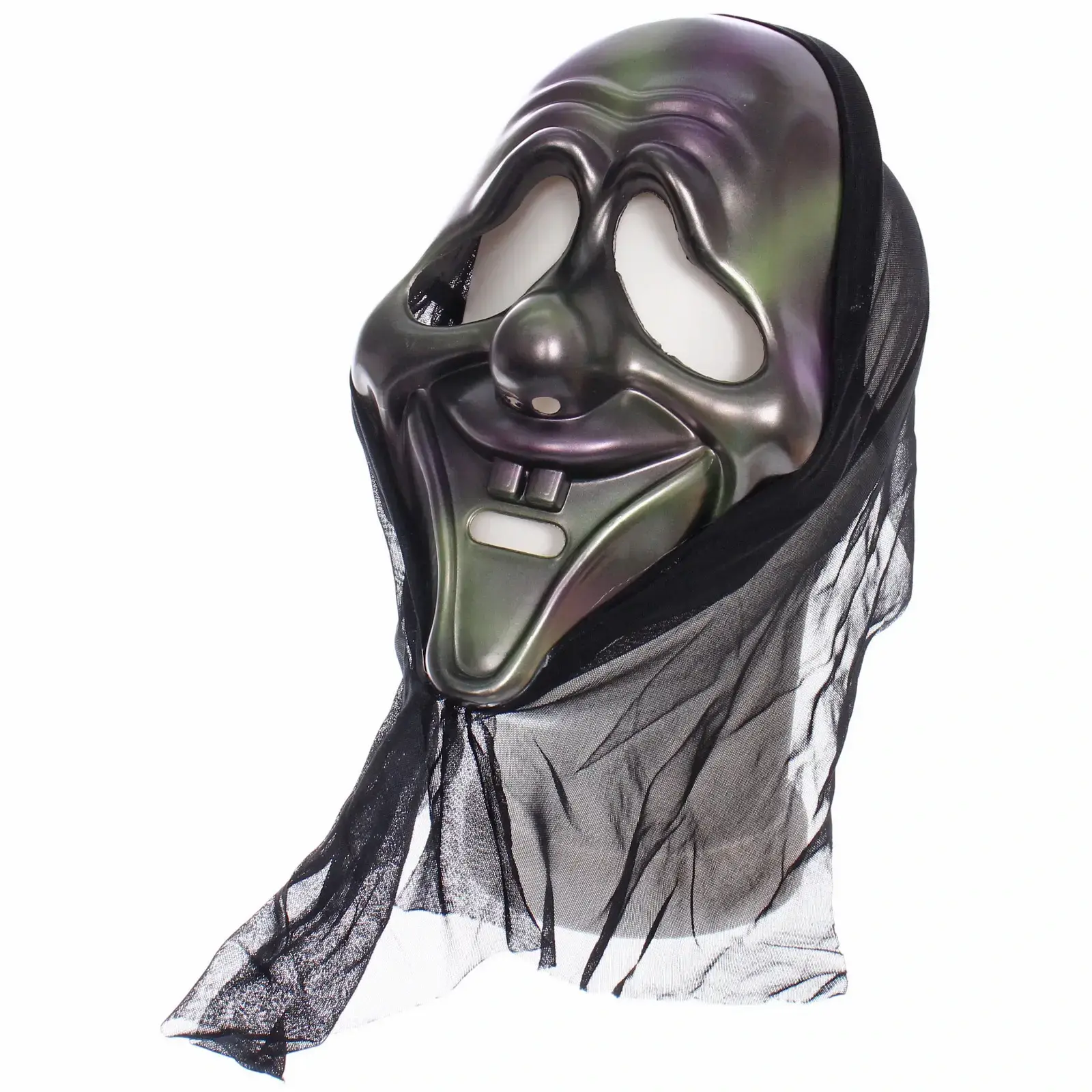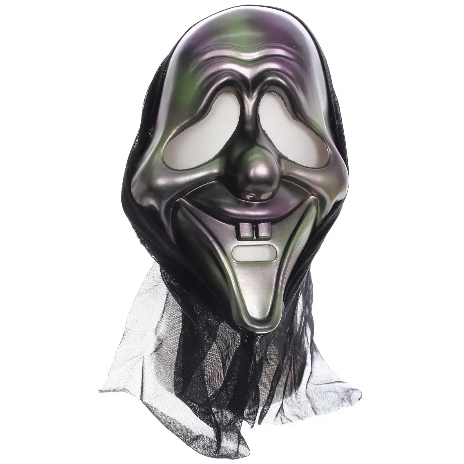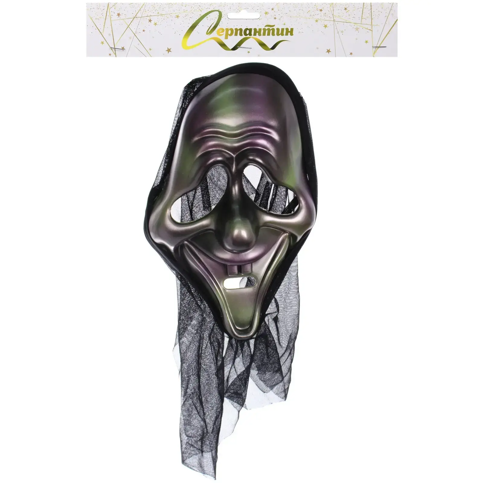 Маска «Пугающий Крик» выделяется своим металлическим блеском и эффектом перехода цвета от фиолетового к зеленому, что придаёт ей особую привлекательность. Черная сетка, имитирующая волосы, добавляет загадочности и завершает образ. Эта маска станет отличным выбором для тех, кто хочет выделиться на празднике и произвести впечатление на окружающих.