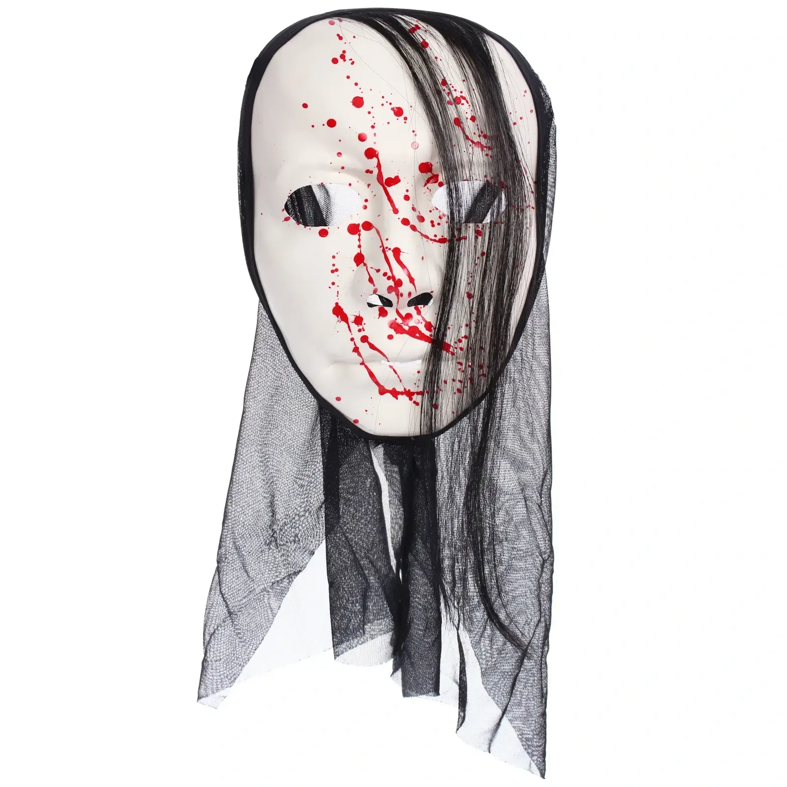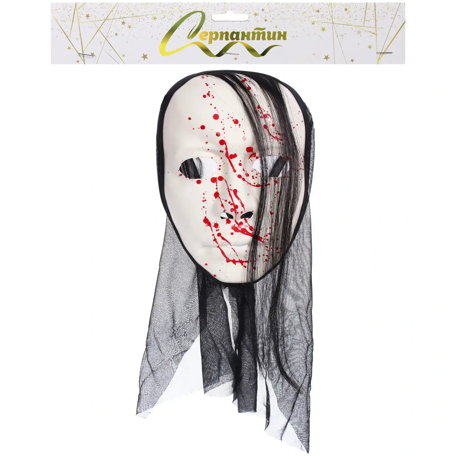 Эта маска выделяется своим оригинальным дизайном: белый цвет с черными деталями и красными брызгами, создающими эффект крови, придают ей зловещий вид. Длинные черные волосы, выполненные из текстиля, добавляют загадочности и делают образ завершенным. Маска легкая и удобная, что позволяет носить её в течение длительного времени без дискомфорта.