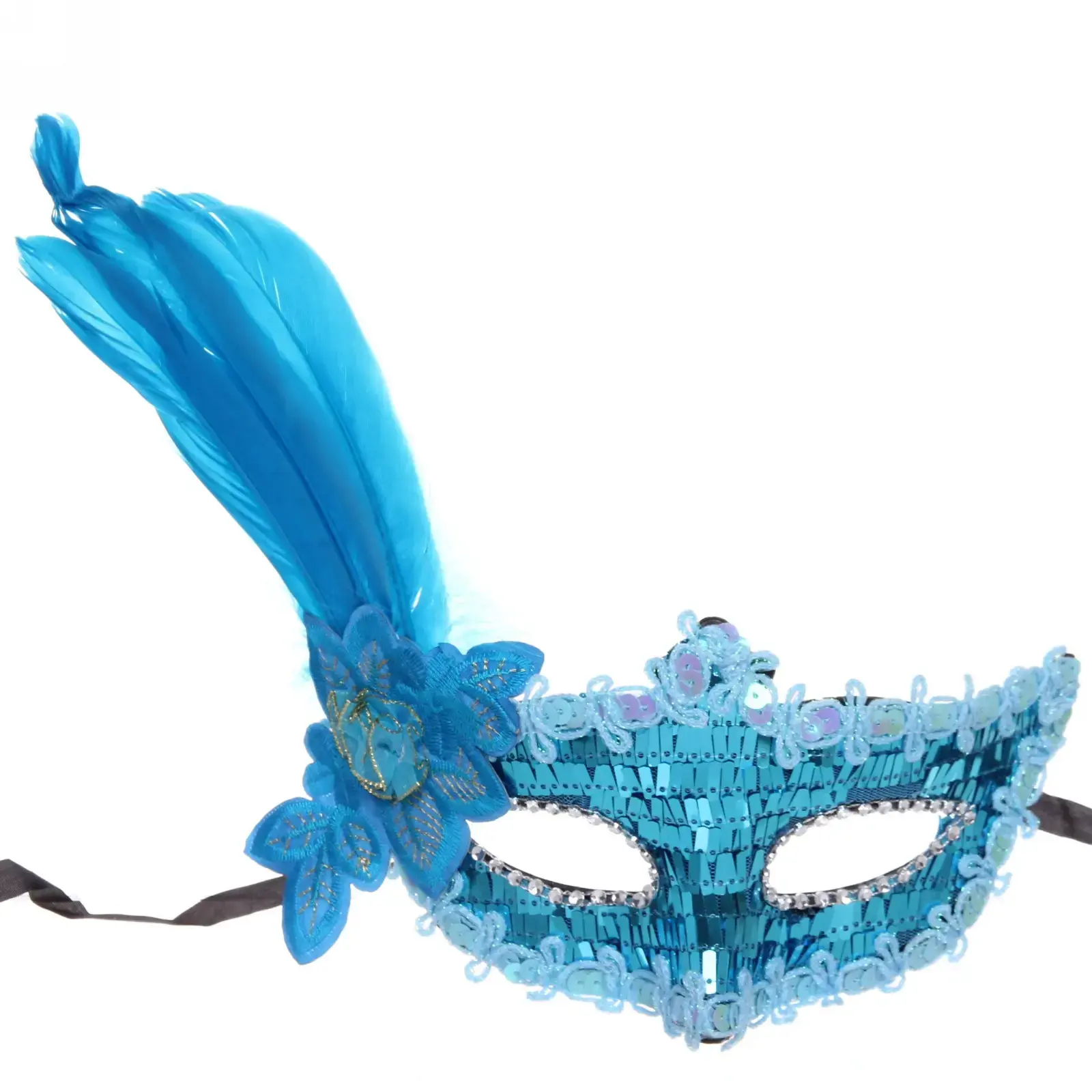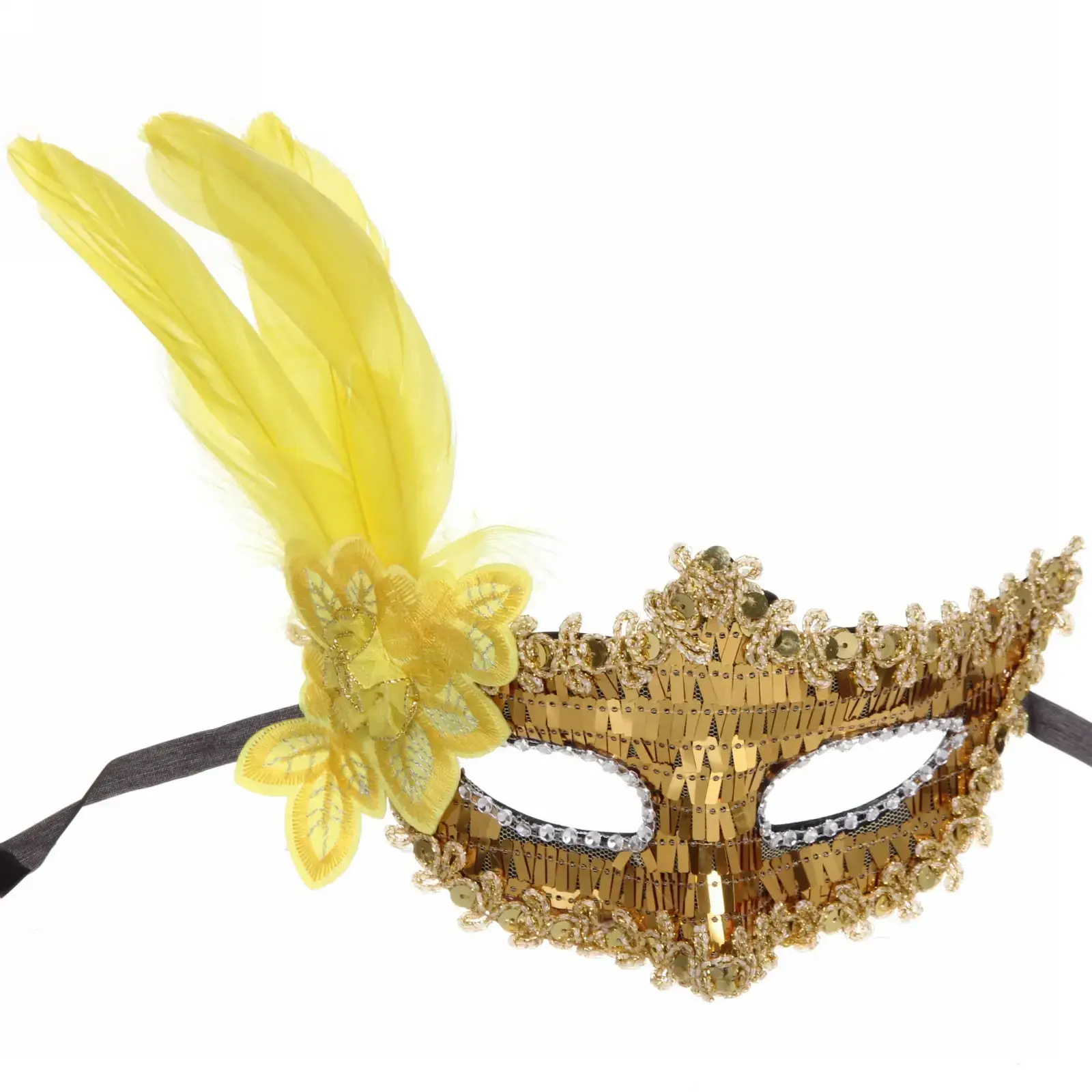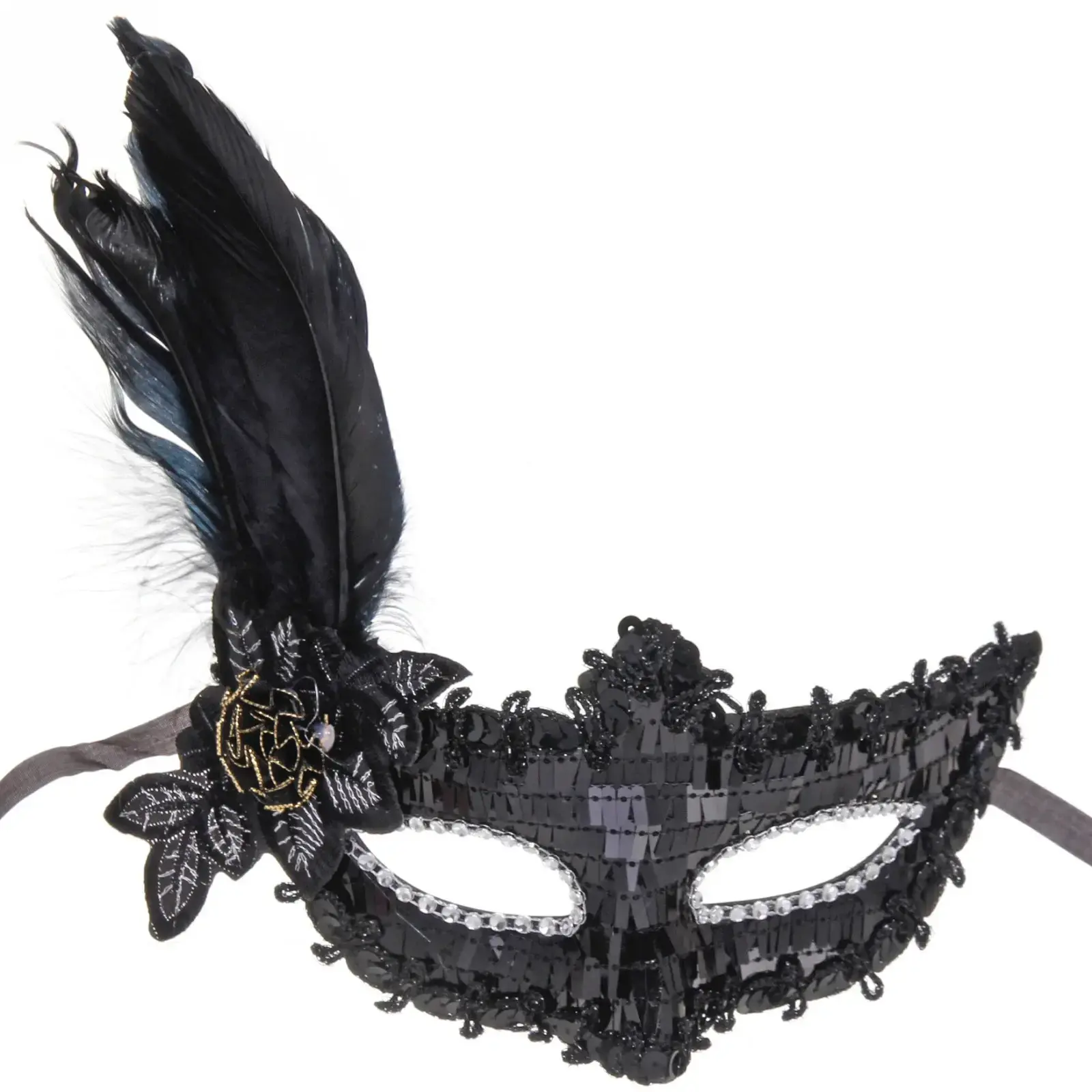 - Декорирована перьями и блестящими элементами, что придает ей эффектный вид.