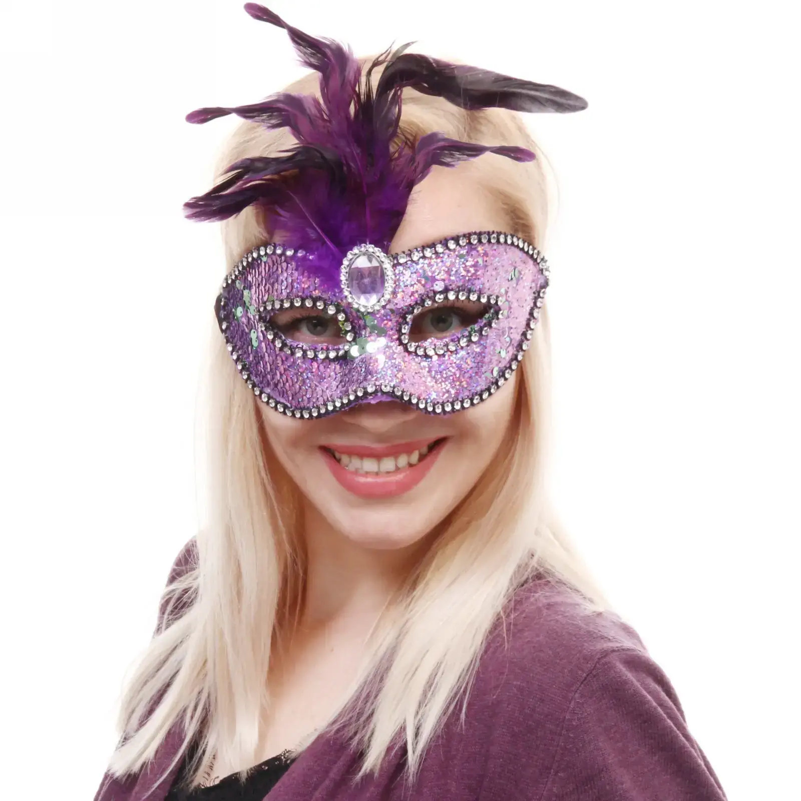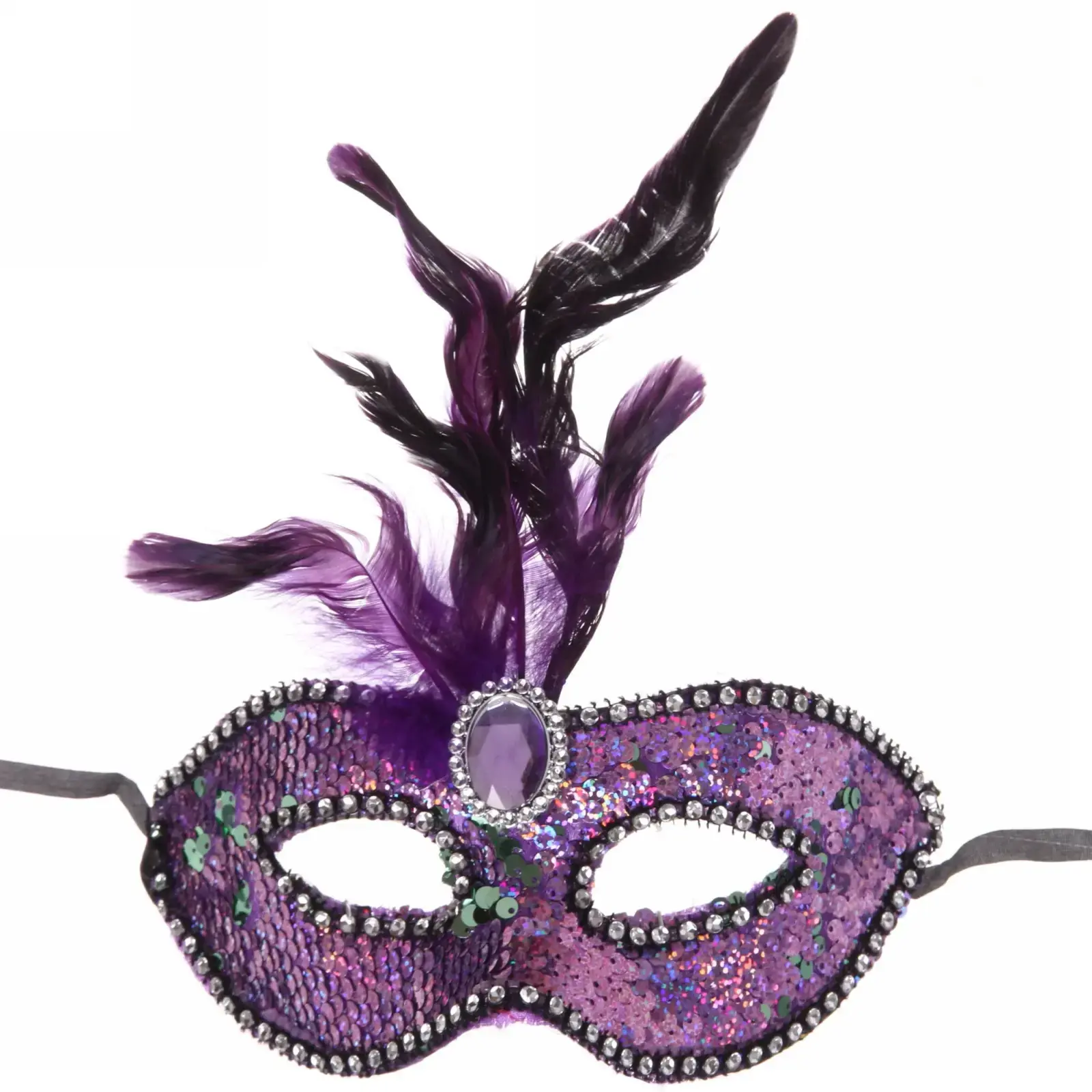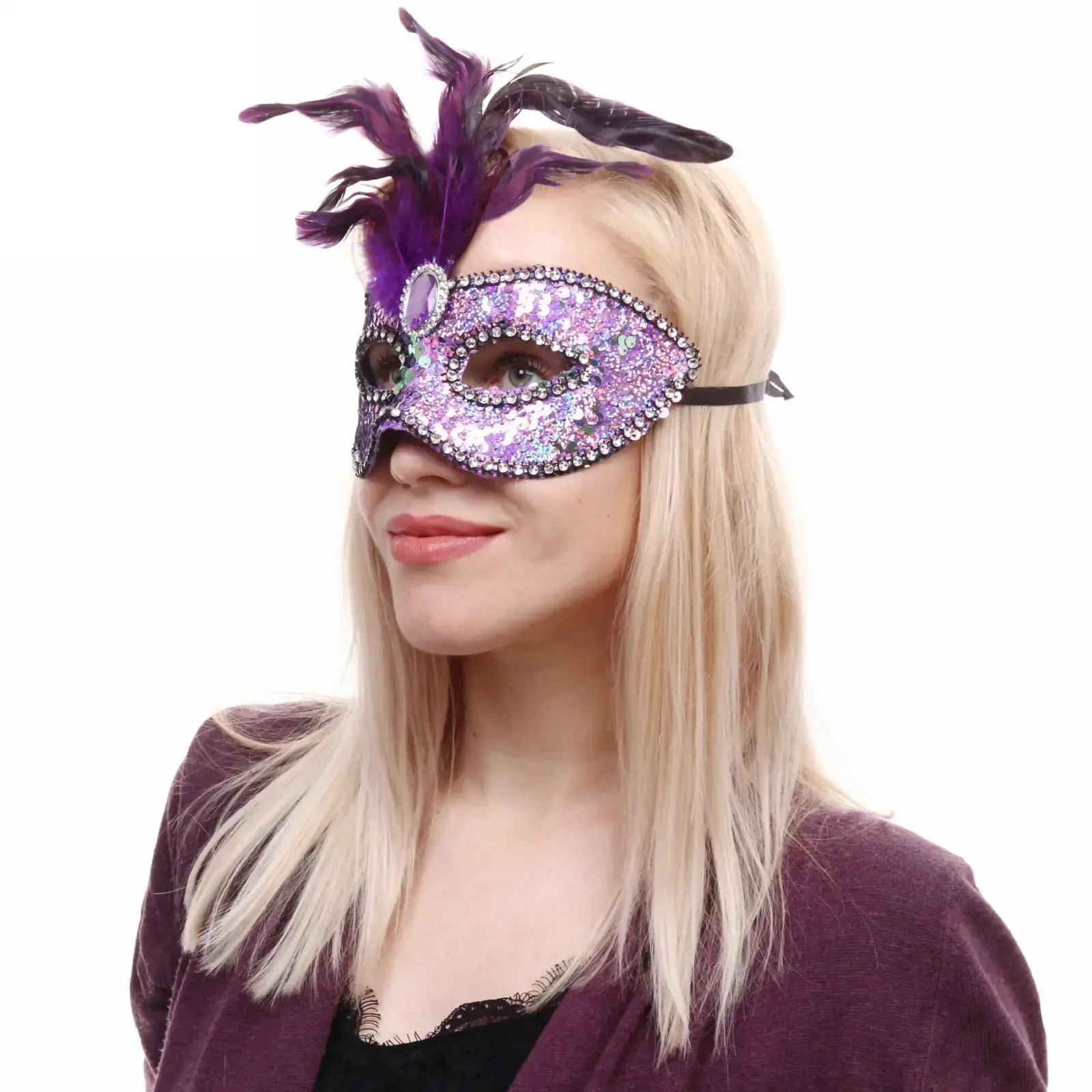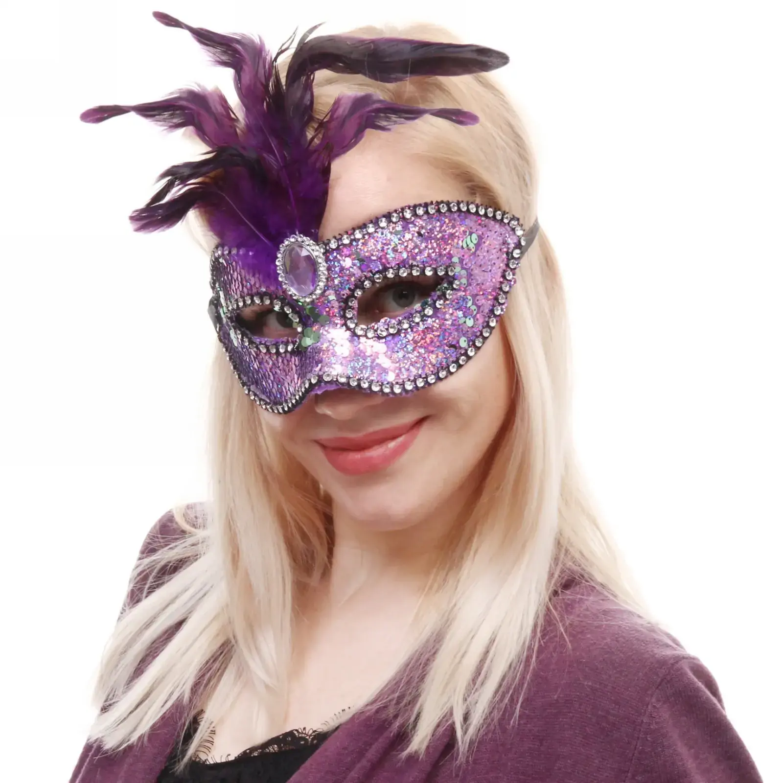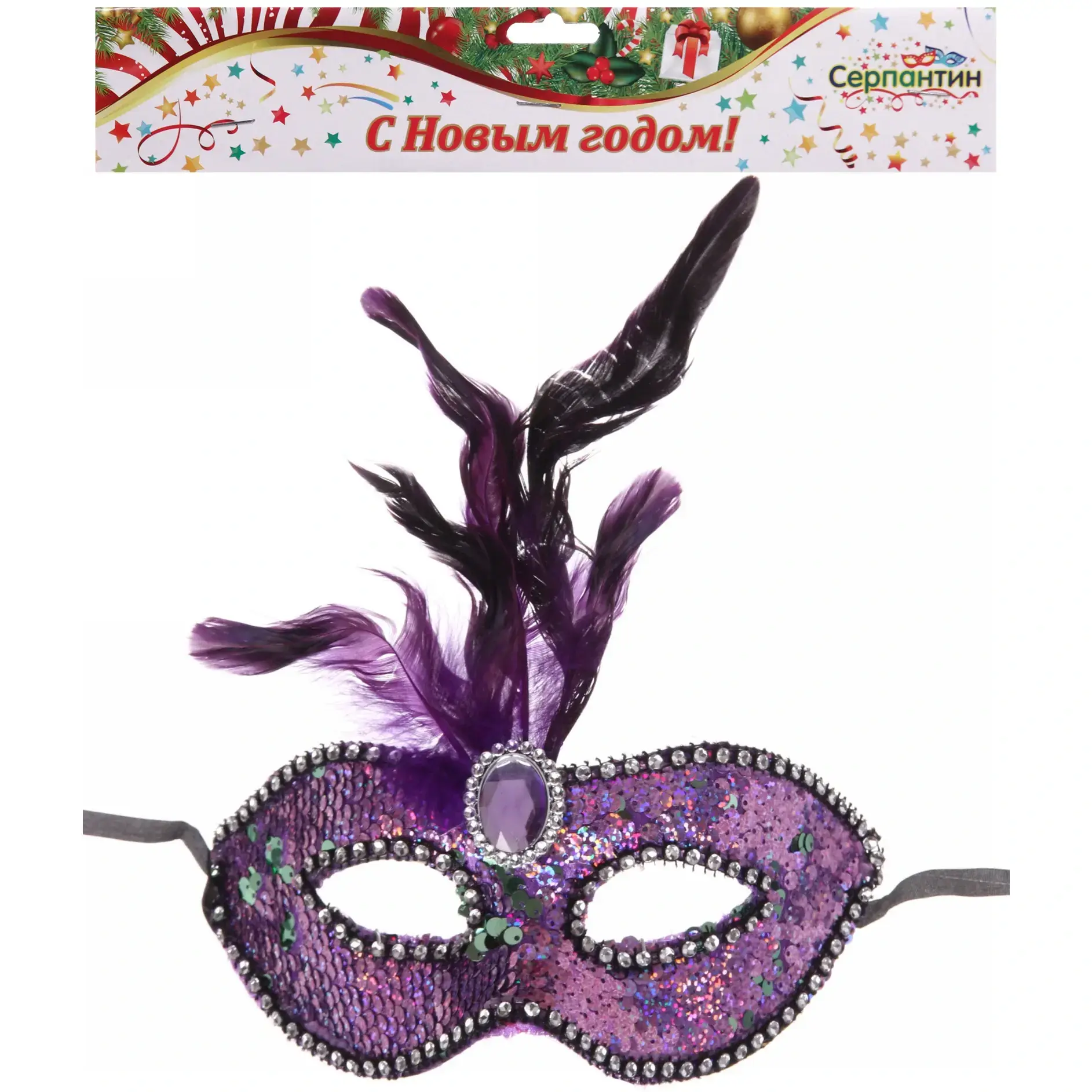 Маска имеет форму, закрывающую верхнюю часть лица, с вырезами для глаз, что обеспечивает удобство и хорошую видимость. В центре маски расположен крупный фиолетовый камень, обрамленный стразами, а по краям добавлены черные перья, придающие ей элегантный вид. Размеры маски не указаны, но она подходит для большинства лиц благодаря своей гибкой конструкции.