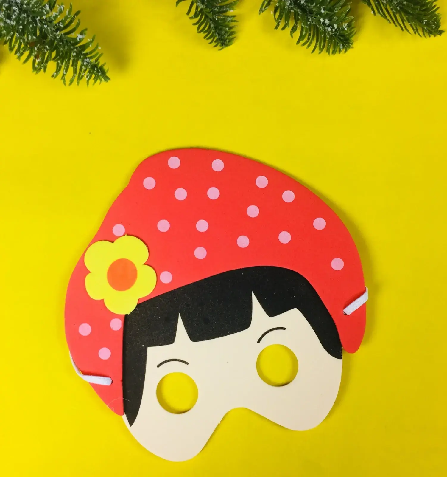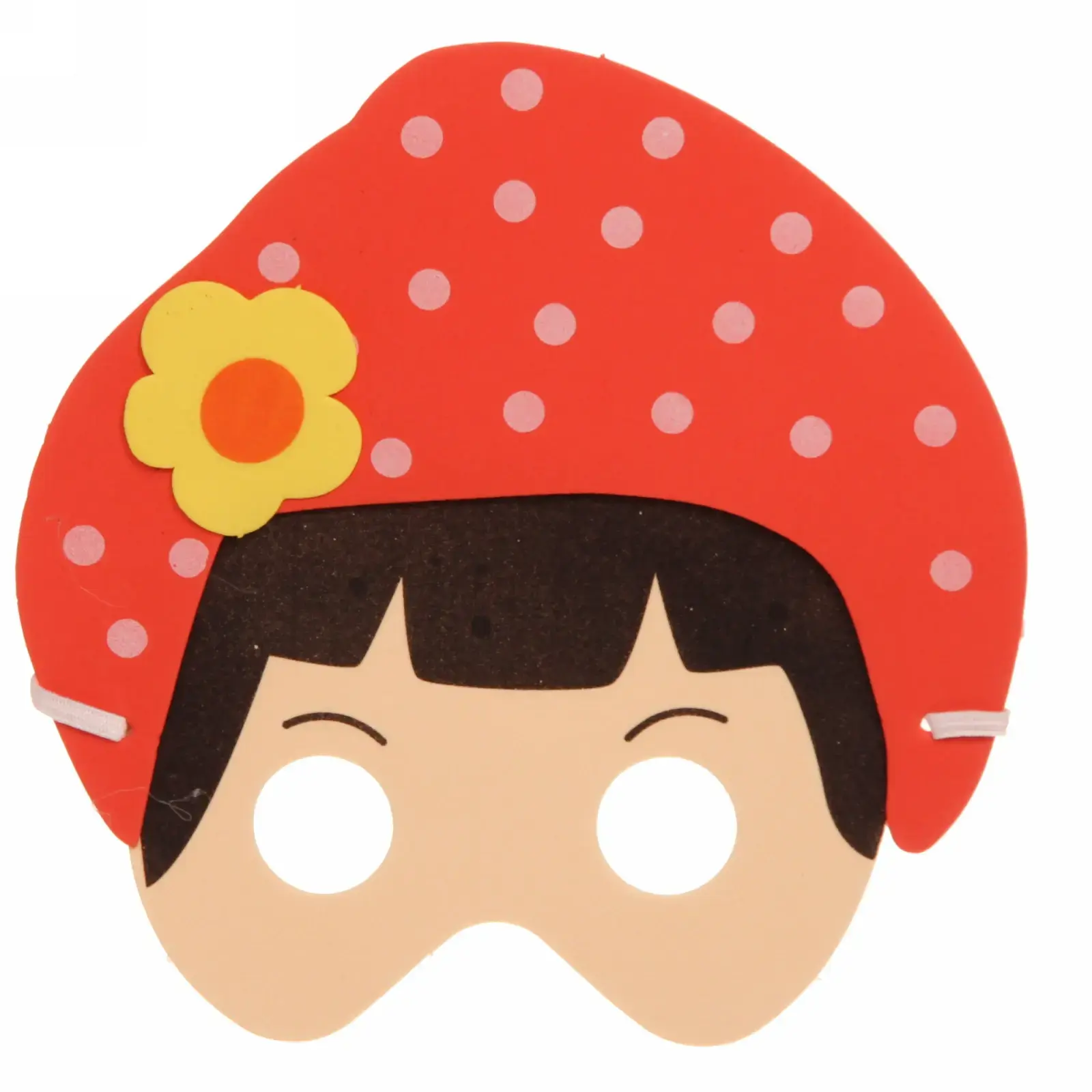 Маска имеет округлую форму, с двумя вырезами для глаз, что обеспечивает комфортное ношение. Основной цвет маски — бежевый с коричневыми чертами лица, а красная шапка с белыми горошками добавляет игривости. Размер маски универсален, что позволяет использовать ее для различных возрастных групп. Не упустите возможность сделать ваш праздник незабываемым с маской «Красавица»!