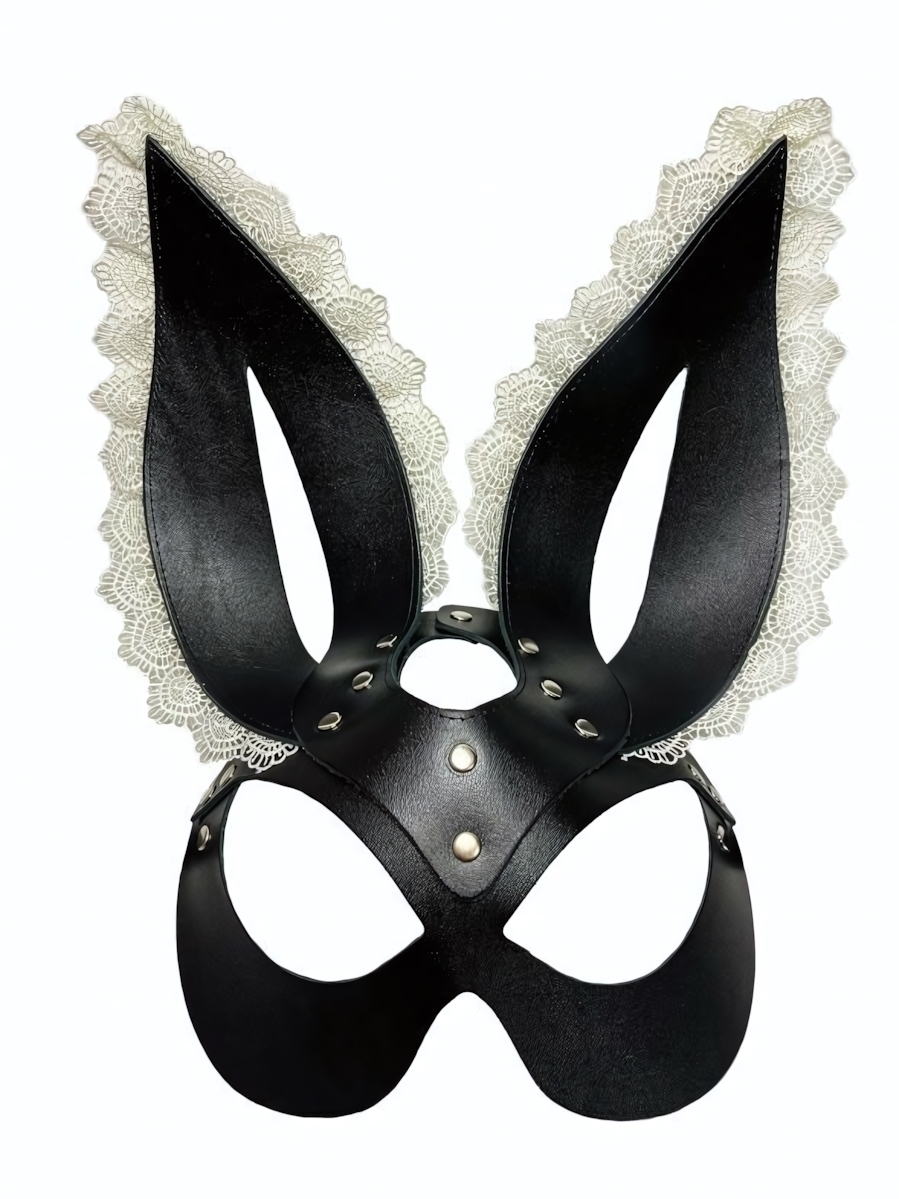 Маска зайки с кружевом на ушках, черная кожа, металлическая пряжка, регулируемая посадка