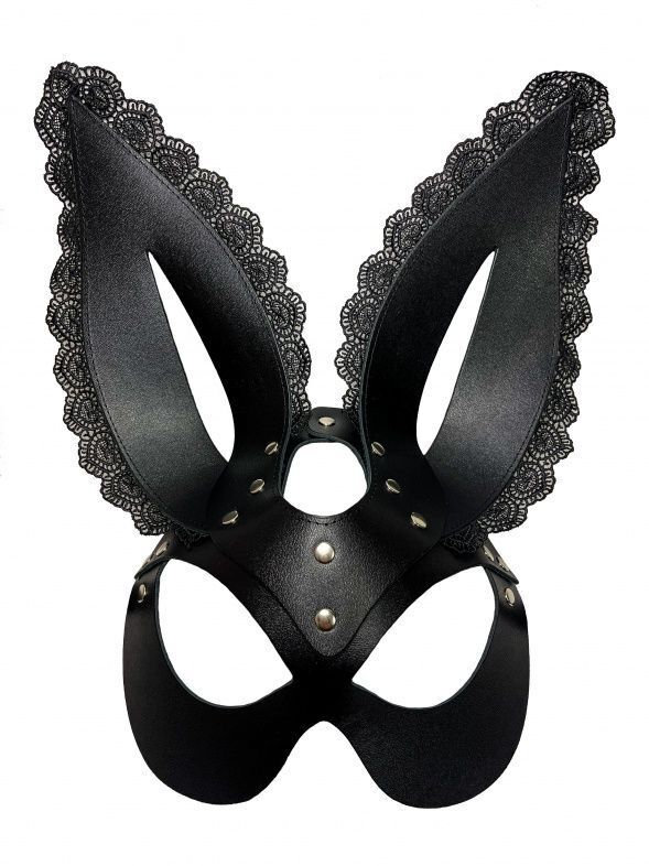 Маска зайки из натуральной кожи, черная, с кружевом на ушках, регулируемый размер