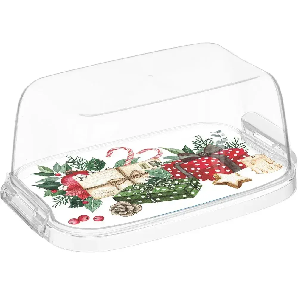 Масленка выполнена из пластика с прямоугольной формой и округлыми краями. Крышка полностью прозрачная и легко снимается. Основание белое, украшенное новогодним декором: подарки, леденцы, еловые веточки и печенье. Цвет товара — бесцветный, идеально впишется в интерьер любой кухни. Удобное решение для организации хранения масла и добавления уюта в повседневные завтраки.