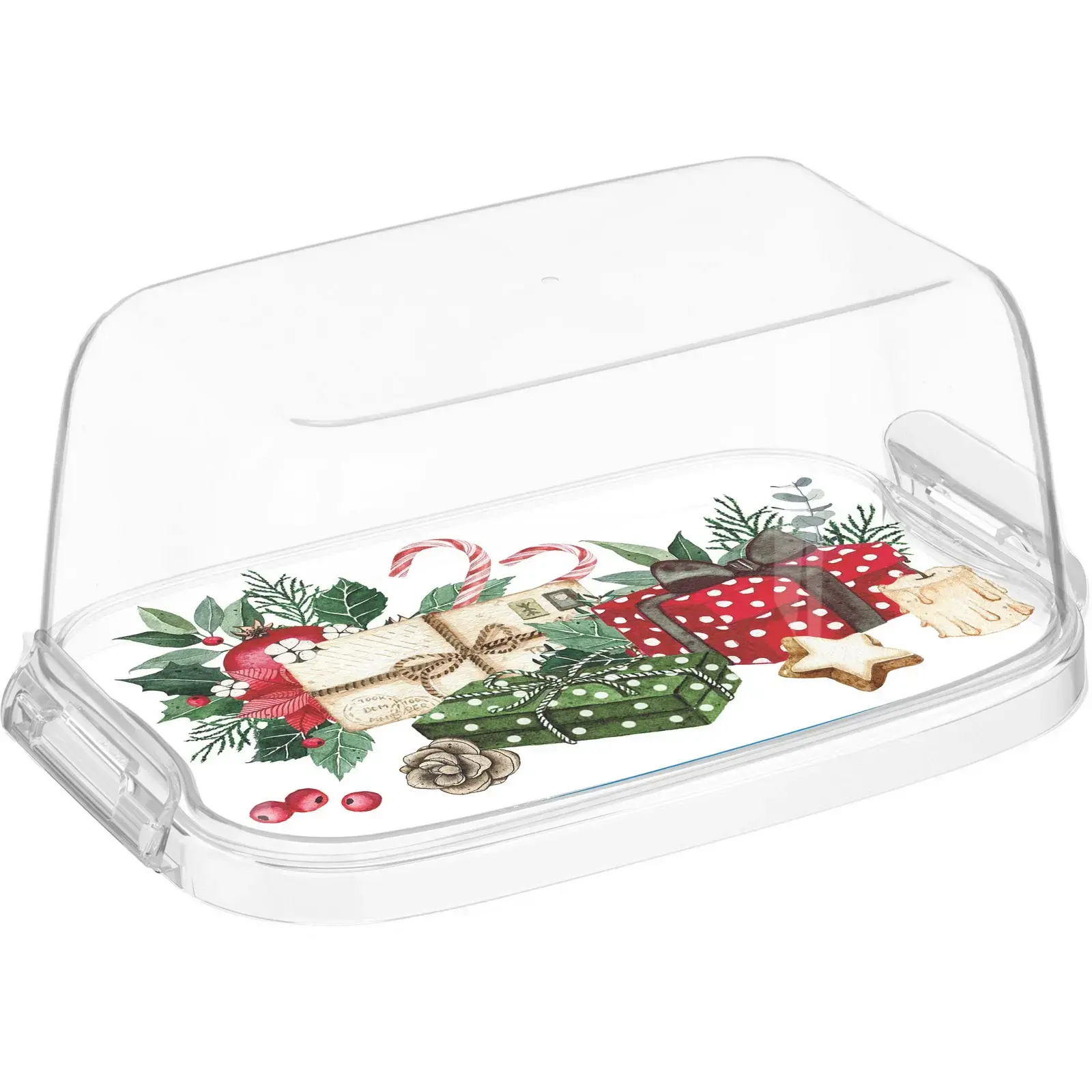 Масленка пластиковая "Bergamo" с новогодним декором, прозрачная крышка, 16х10х7см
