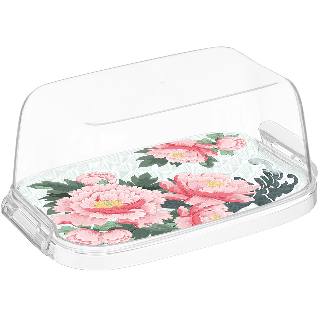 Основание выполнено из пластика и украшено IML-декором, нанесённым с обратной стороны, благодаря чему рисунок «сад пионов» сохраняет аккуратный вид при длительном использовании. Размер 16х10х7 см оптимален для размещения на полке или дверце холодильника. Изделие легко мыть мягкой мыльной губкой, что делает ежедневный уход простым и быстрым.