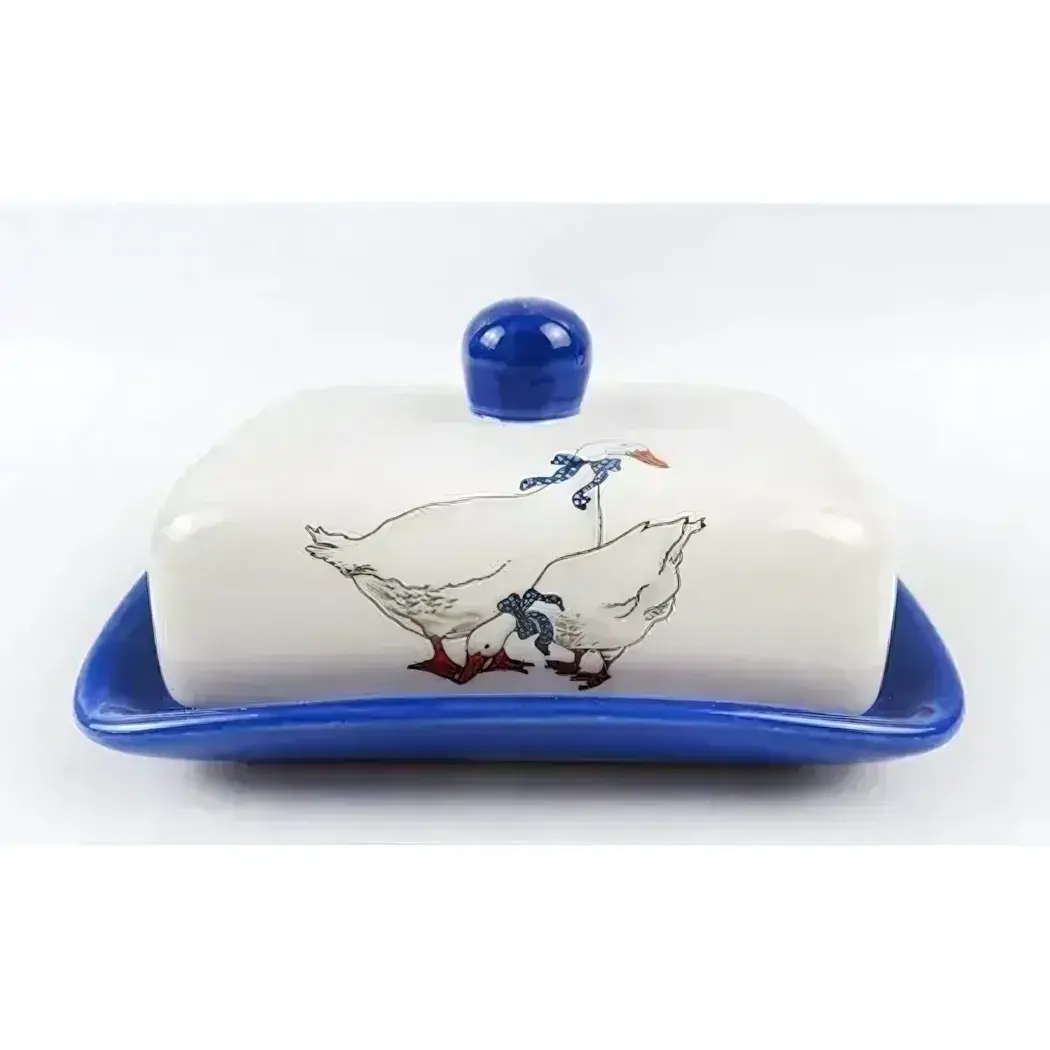 Масленка 'Гуси' с пластиковой крышкой и синей подставкой, подарочная упаковка
