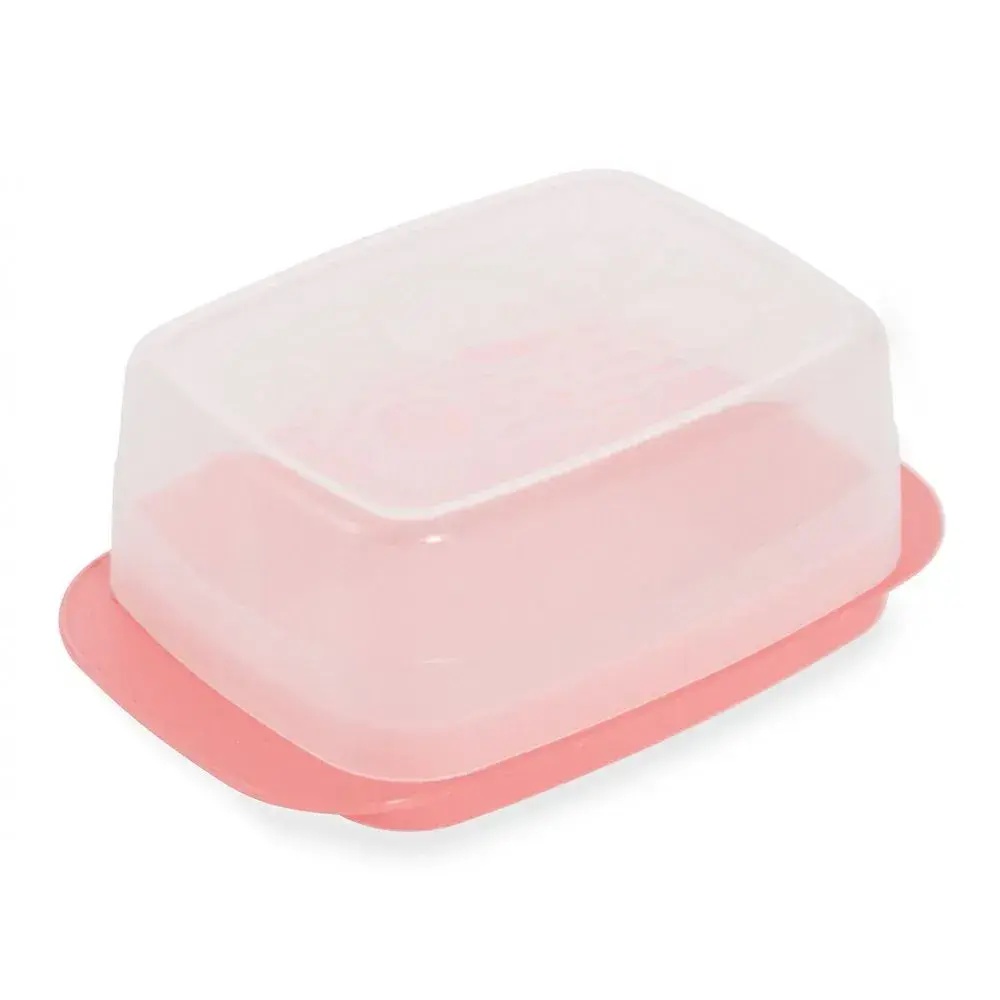 Масленка выполнена из высококачественного пластика, сохраняет свежесть масла и других продуктов. Цвет основания — розовый. Крышка — прозрачная, позволяет контролировать остаток продукта, а специальная конструкция препятствует протеканию и испарению. Благодаря компактной форме масленка легко помещается на полке и не занимает лишнего пространства, а современный дизайн впишется в любую кухню.
