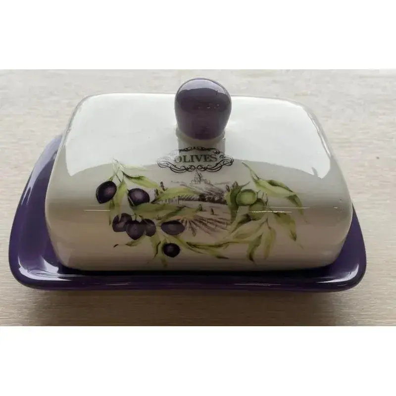 Масленка керамическая с крышкой, подарочная упаковка, узор оливки и листья, белая с фиолетовой подставкой