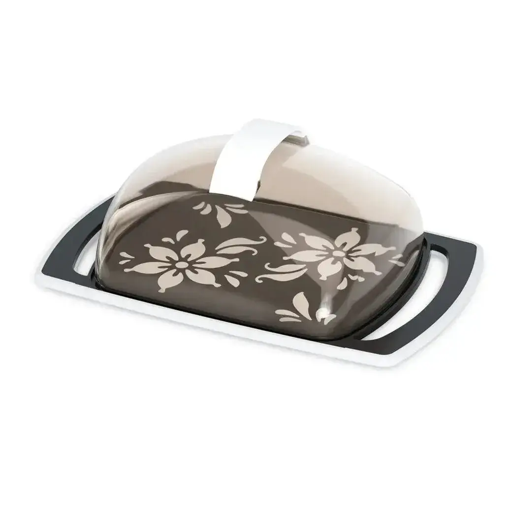 Сочетание прозрачного пластика крышки и темно-серого основания с изящным цветочным орнаментом делает эту масленку стильным акцентом на кухне. Прямоугольная подставка обеспечивает устойчивость, а скругленные углы упрощают очистку.