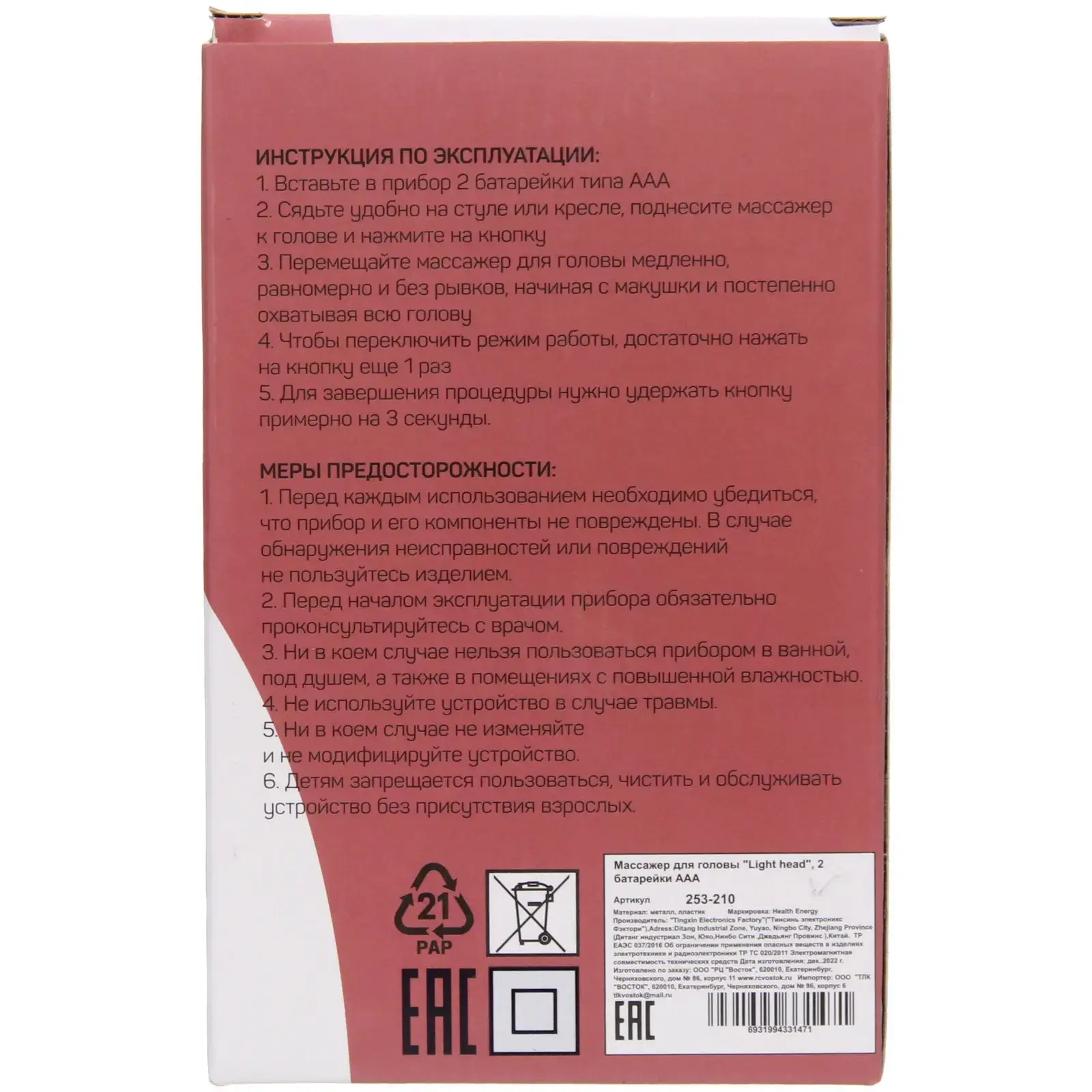 Массажер выполнен из качественных материалов: металл и пластик, что обеспечивает его долговечность и надежность. Устройство работает от двух батареек типа AAA, что делает его удобным для использования в любом месте. Не упустите возможность улучшить свое самочувствие и добавить в свою жизнь немного комфорта с массажером для головы «Light head»!