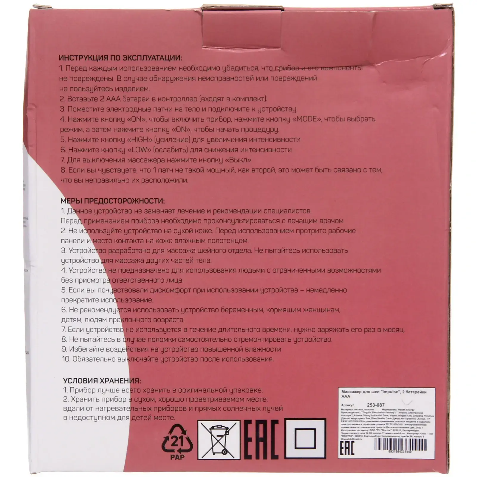 Массажер выполнен из качественных материалов: металл и пластик, что обеспечивает его долговечность и надежность. Устройство имеет компактные размеры, что делает его удобным для хранения и транспортировки. Не упустите возможность подарить себе или своим близким комфорт и заботу о здоровье с массажером для шеи «Impulse»!