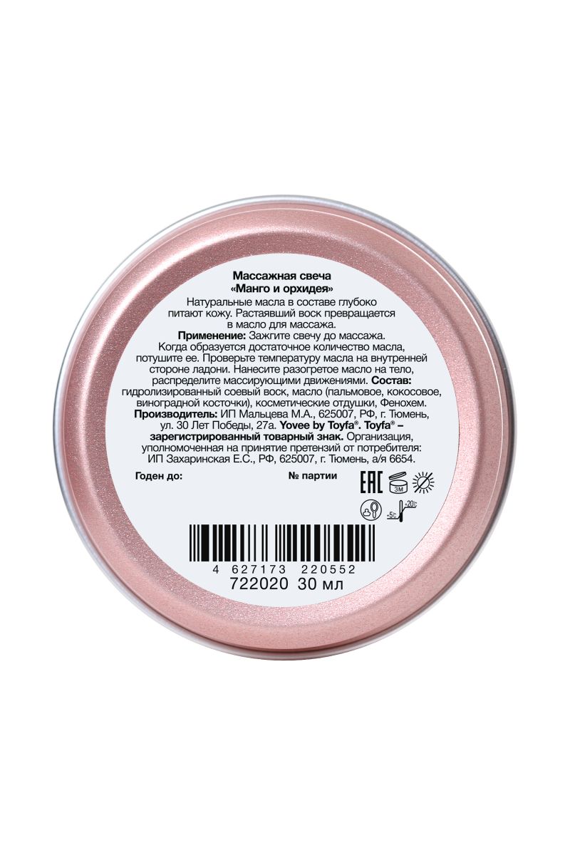 Массажная свеча «Сладкий массаж» с ароматом манго и орхидеи помогает создать чувственную атмосферу и превратить обычный вечер в особенный ритуал для двоих. После разогрева воск превращается в теплое ароматное масло, которое мягко скользит по коже, питает и увлажняет её, делая прикосновения более нежными и запоминающимися.