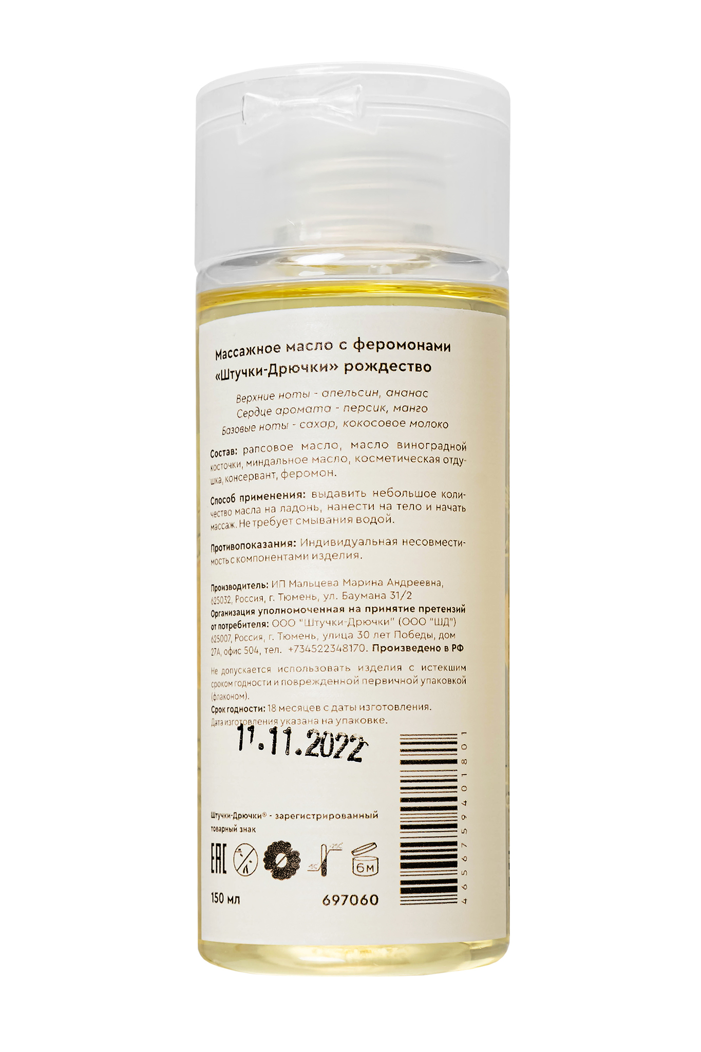 Массажное масло с феромонами «Рождество», 150 мл, натуральный состав, увлажнение кожи, прозрачное