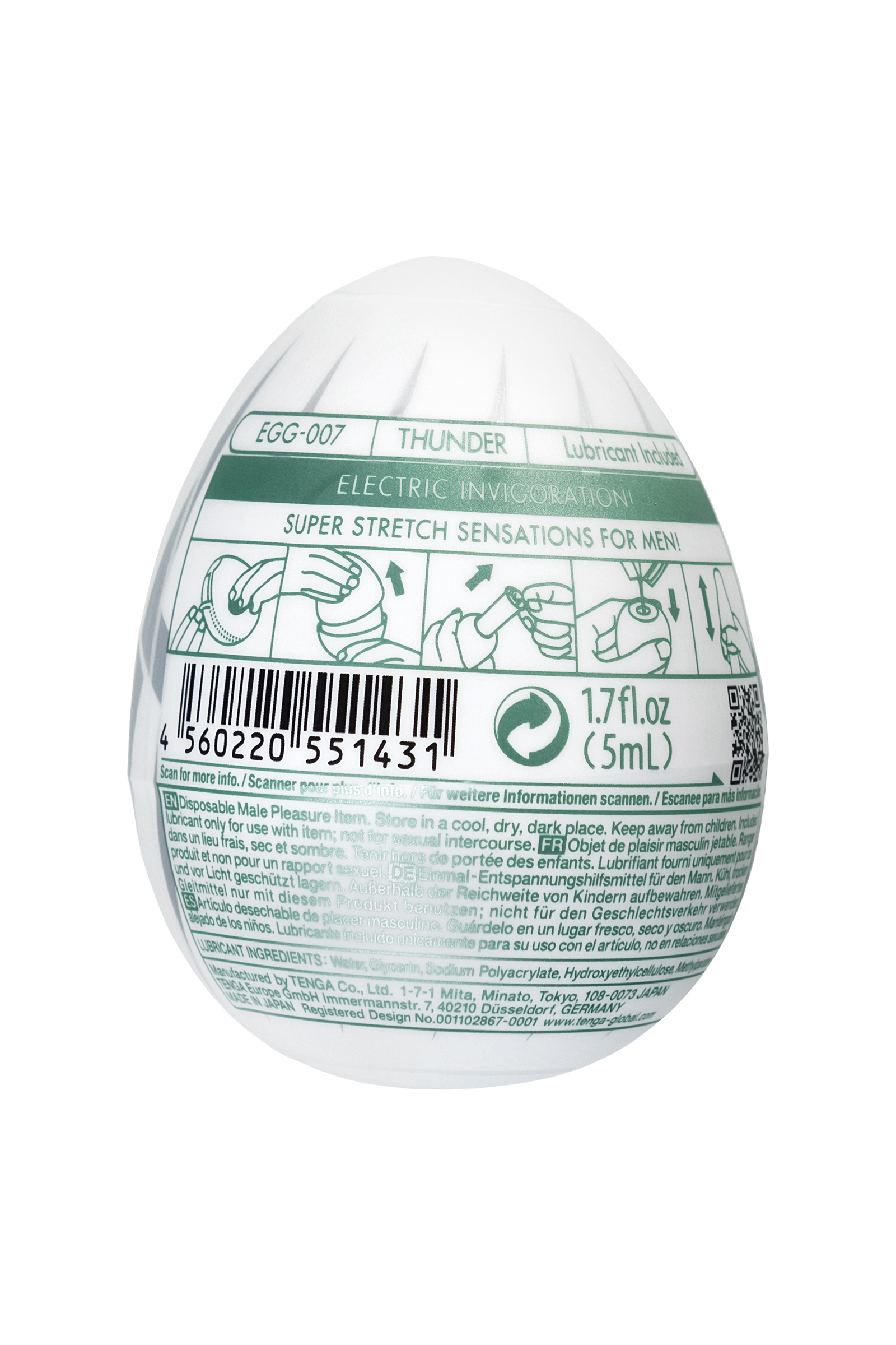 Использовать Tenga Egg Thunder просто и удобно. Снимите пленку с помощью отрывного лепестка и откройте яйцо. Внутри вы найдете упаковку с лубрикантом и супермягкую, сверхэластичную секс-игрушку. Нанесите лубрикант внутрь силиконового яичка, оденьте его и наслаждайтесь! Эти яички прекрасно растягиваются в длину и принимают форму любого пениса, что делает их универсальными для использования.