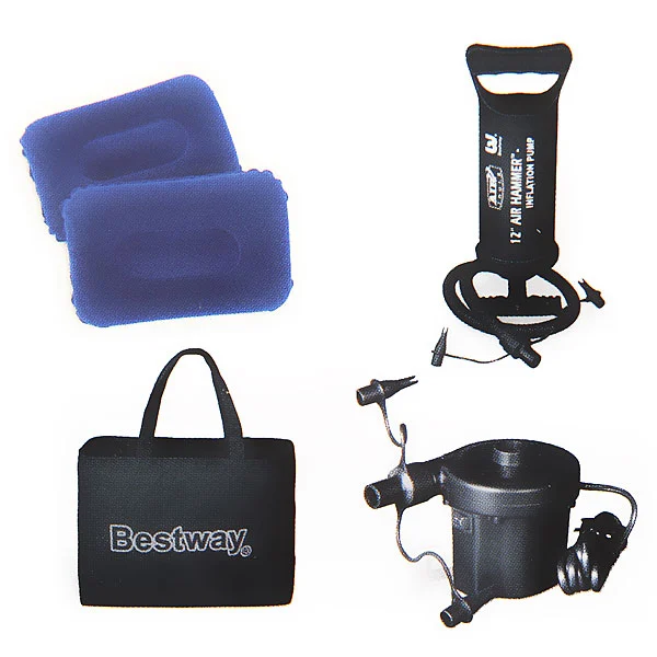 Матрас оснащен внешним электрическим насосом на 220В, который позволяет быстро надуть его до нужной жесткости всего за несколько минут. Такой насос удобен в эксплуатации и обеспечивает надежную герметичность. После использования матрас так же легко сдувается и компактно складывается для хранения или транспортировки.