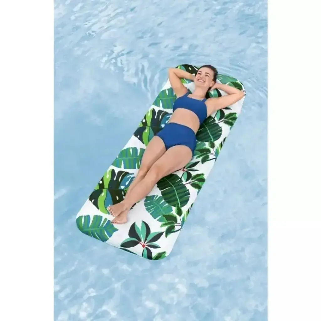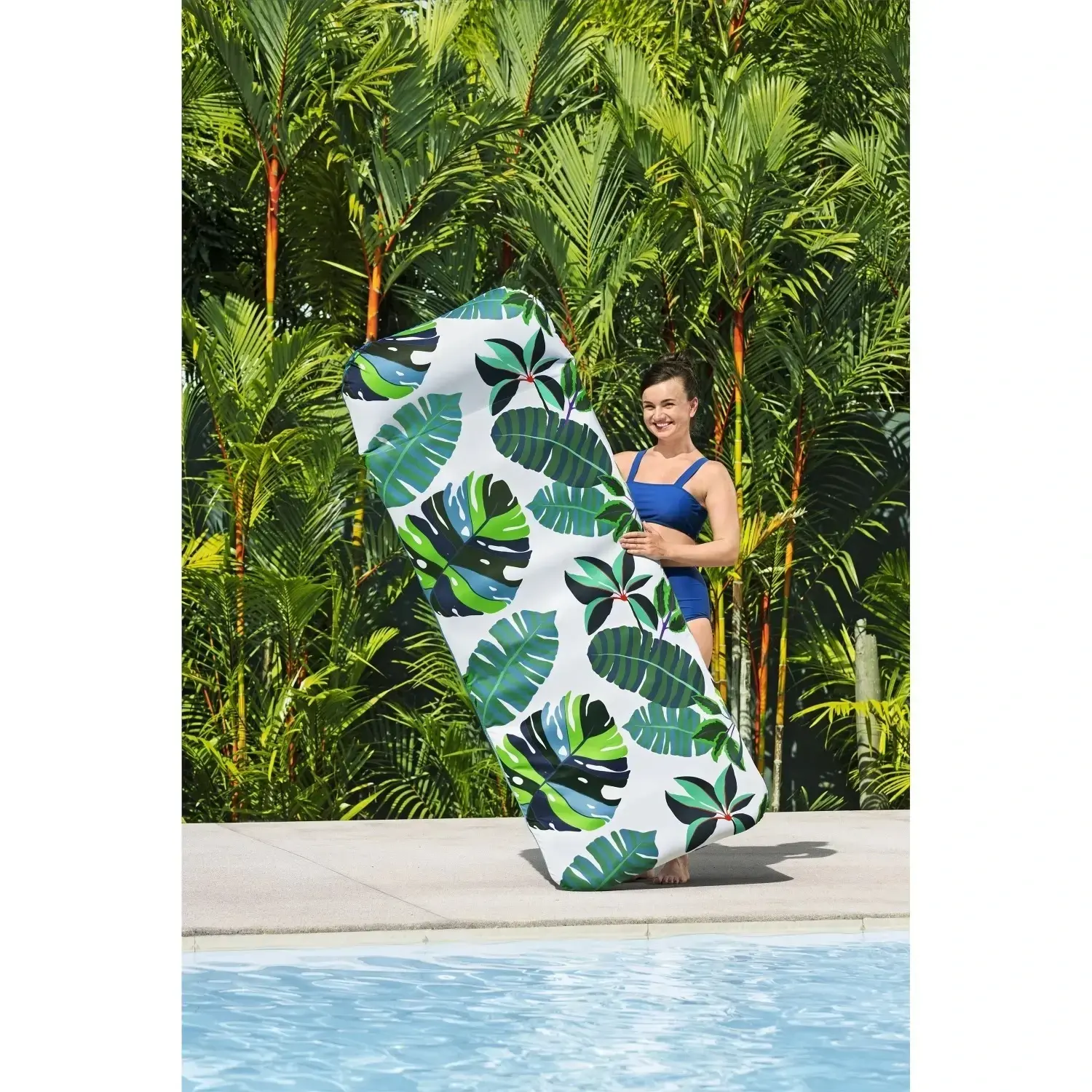 Матрас изготовлен из качественного ПВХ, что обеспечивает его долговечность и устойчивость к повреждениям. Тканевый чехол добавляет комфорт и предотвращает скольжение. Уникальный дизайн с ярким принтом в виде листьев не только привлекает внимание, но и создает атмосферу тропического отдыха. Кроме того, матрас оснащен двумя воздушными камерами, что обеспечивает дополнительную безопасность и комфорт.