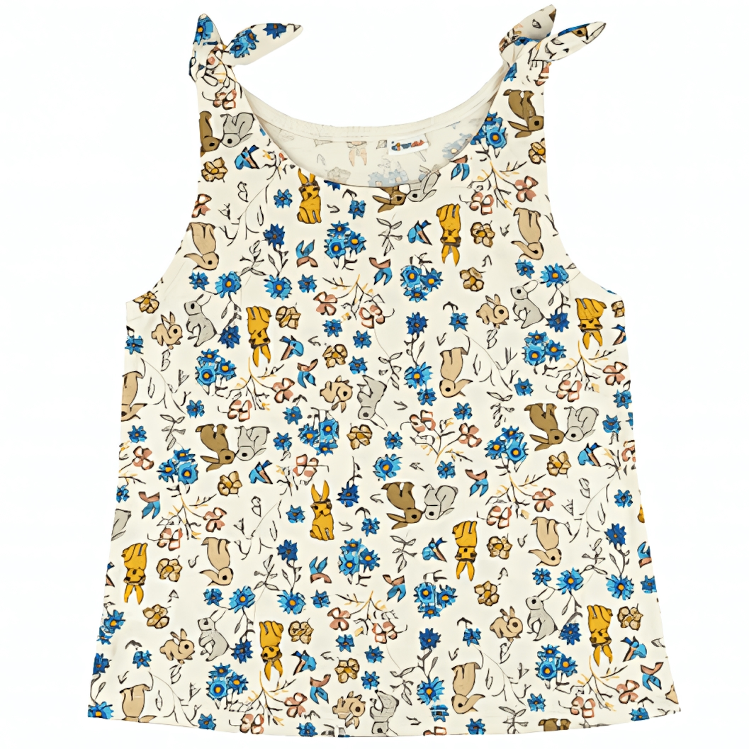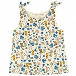 Эта майка для девочки сочетает в себе мягкость натурального хлопка и яркое настроение детского дизайна. Изготовленная из 100% хлопка, она отлично пропускает воздух, позволяя коже дышать даже в тёплые дни, и остаётся приятной на ощупь. Светлая ткань с симпатичным узором, включающим цветочные мотивы и изображения животных, добавляет образу нежности и игривости.