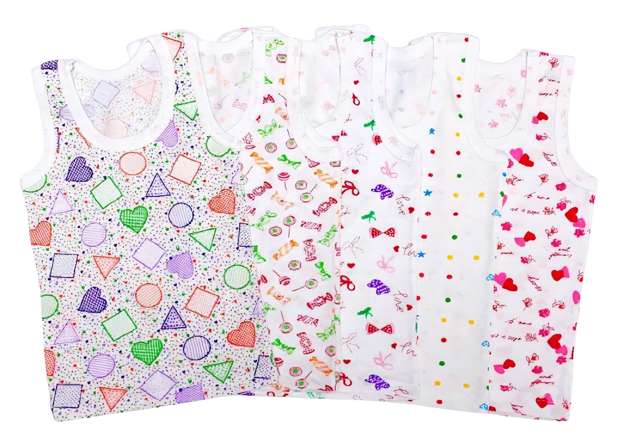 Размер — 26, что подходит для девочек младшего возраста. Майка имеет стандартную длину и круглый вырез. Принты могут включать сердечки, геометрические фигуры, изображения сладостей и другие детские мотивы, что добавляет игривое настроение образу.