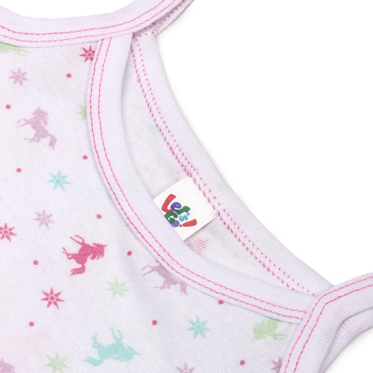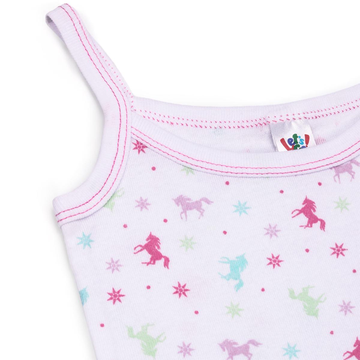 Материал: 100 % хлопок. Цвет: белый с разноцветным принтом. Размер: 92‑152 см (подходит девочкам от 3 до 10 лет). Конструкция без рукавов, круглый вырез горловины, декоративные швы в розовой нити для дополнительного акцента.